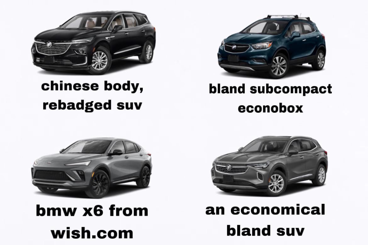 Buick’s current lineup in a nutshell… memeregular car reviewsRegular CarsRegular Cars MemeRelated Posts Reversible rail vehicle January 14, 2026 What is this car? January 14, 2026 2027 Ram Dakota. The Official Pickup Of…. January 14, 2026 [Aston Martin Valkyrie] in South Beach January 14, 2026 IT’S A [ROVER 200] January 14, 2026 6 Grand Gets The Forgotten Shelby January 14, 2026Write A CommentYou must be logged in to post a comment.