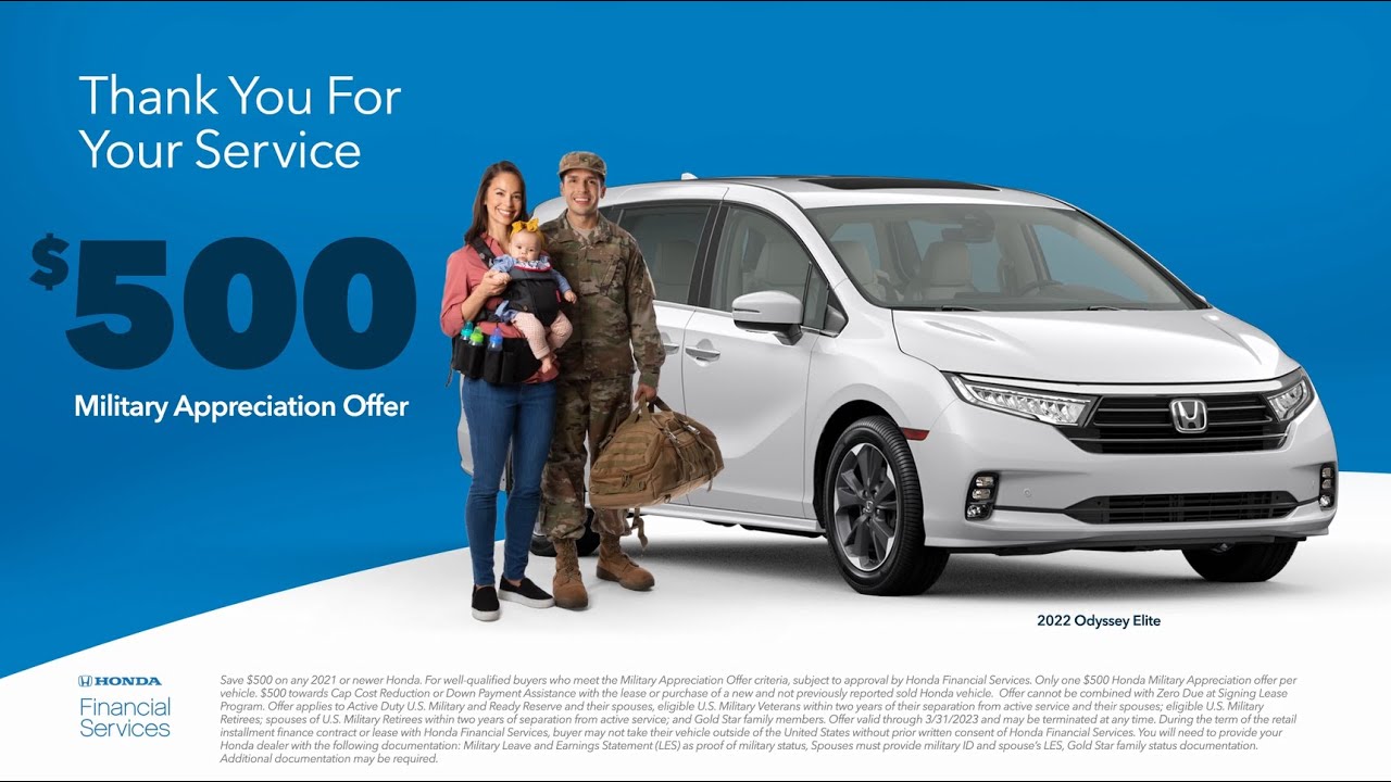 U.S. Military service members and their families can save $500 on a 2022 or newer Honda vehicle when they finance or lease with Honda Financial Services.