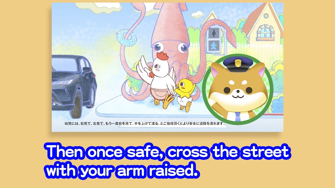 [音楽] こんにちはであります 本館は 町の交通安全を守る 犬のおまわりさんであります今日は本館と 一緒にみんなで道路を渡る時の約束を勉強 するのであります始まり始まり お天気のいい日クックとママはお友達の 待っている公園に向かっています ママ早く公園行こうよ そこにダイオウイカさんが現れました ダイオウイカさんこんにちは こんにちはすみません 仲良し海岸はどっちでしょう まあまあ早く クマオ君たちが待ってるよ [音楽] 沼尾君 だクックは公園の入り口にいた 熊尾くんを見つけて 走り出しました 止まりなさいクック ママが叫んでいるけどクックは止まりませ ん 信号は青だけど横から車が曲がってきてい ます [拍手] 危 ない時期一発ダイオウイカさんがクックを 長い手で捕まえました 危なかったね 道路を渡る時にはどんなことに気をつけ ないといけないかクックと一緒にみんなで 勉強するのであります 道路を渡るときは 信号が青でも赤でもまず 止まろう青になったら車が来ていないか ちゃんと見て 手を挙げて渡る [音楽] それじゃ 練習するのであります道路を渡る時は ストップ ストップ青でもストップ右見て左見て手を 上げてフック 達も無事に公園に到着したであります みんなも道路を渡る時にはまずはしっかり 止まらないといけません お家の中で安全に止まる練習ができる シールも用意しているのでお家の人と何回 も練習するのであります シールの使い方の動画も見てほしいので あります また会いましょう ご安全に