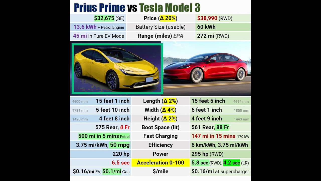 Prius Prime vs Tesla Model 3 Plug in Hybrid vs EV Range Price Weight Size Side by Side