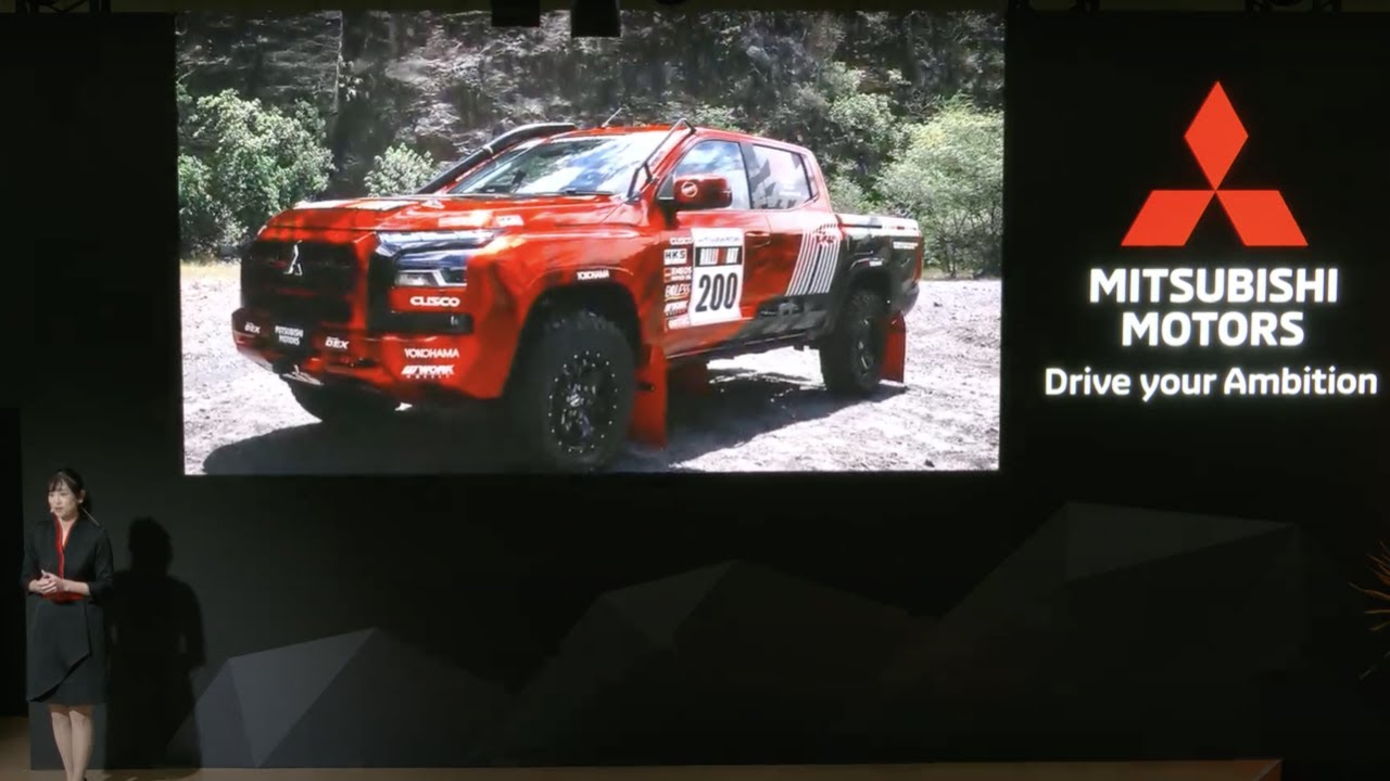 さあ行こう十王無人な冒険へ人は生まれ ながらに冒険を発する存在である見たい 知りたいやってみたいその好きない好奇心 のまま走り 続ける見たことのない景色新しい何かへの 挑戦自由にどこまでも駆け抜けたいという 思い そんな冒を三菱自動車は投し ます山も雪も森も土も青い地球を重無人 に三菱自動車でさあ冒険へ出かけよう こちらのステージでは私たち三菱自動車の そんな思いを形にした7台の展示者をご 紹介し ます まずはこちらのステージ側に展示しており ます3台の展示者から新型トライトンをご 紹介し ます新型トライトンは 1978年に発売されたポルテをルーツと し45年間で約5600万台を 生産世界約150カ国で売してきた戦略者 が12年ぶりに日本で発売パワーフォ アドベンチャーをコンセプトとしデザイン 車子ラダーフレームエンジンなど 一進ボディタイプはダブルキャブ駆動方式 は4wd都市マニースポーツやウインター スポーツキャンプといったアウトドア アクティビティの可能性を広げ冒険心にお 答えする三菱自動車らしさを象徴する モデルです そしてピックアップトラックに求められる 剣性アロ相性実用性に加えSUV並の快適 性や先進性を兼ね備えた新しい ピックアップトラック [音楽] です続いてご紹介するのはこちらアジア クロスカントリーラリー2023に参戦し た新型リーカーとデリカD5サポートカー です新型トライトンラリーカーはダカール ラリー総合優勝の実績を持つ松岡が監督を 務めるチーム三菱ラリーアートとして参戦 個人総合3位参戦した3台全てが完走し チーム賞を受賞しました用のダブルキャブ をベースとしFのグループT1て新型 トライトンの剣性アクロ相性ハンドリング 性能をさらに強化しラリーでの戦闘力を 大幅にアップ新開発の2.4Lディーゼル ターボ エンジン前後サスペンションや前後LSD 軽量アミホイールなどラリーシならではの カスタマイズを 実現また湧き上がる溶岩のエネルギーをし たレッドとブラックのツトカラーに デカールを何層にも重ね深く立体感のある デザインとしてい