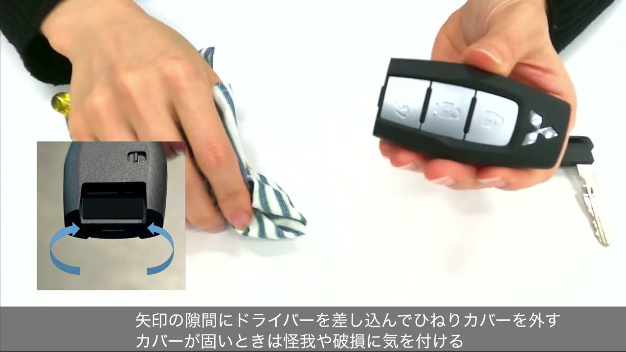 [音楽] ください最後にボタンを押した時に多動 表示灯が赤く点灯することを確認して くださいこれで電池交換は完了 です電池の寿命は使用状況によりますが約 2年程度です電池が消耗したと感じた時は 早めに新しい電池と交換をしてください 故障の原因になるため内部回路電子端子 などには触れないようにして ください電池交換をしても正常に作動し ない時やご自身での交換が難しいと感じた 時はお気軽に三菱自動車販売会社へご相談 [音楽] ください