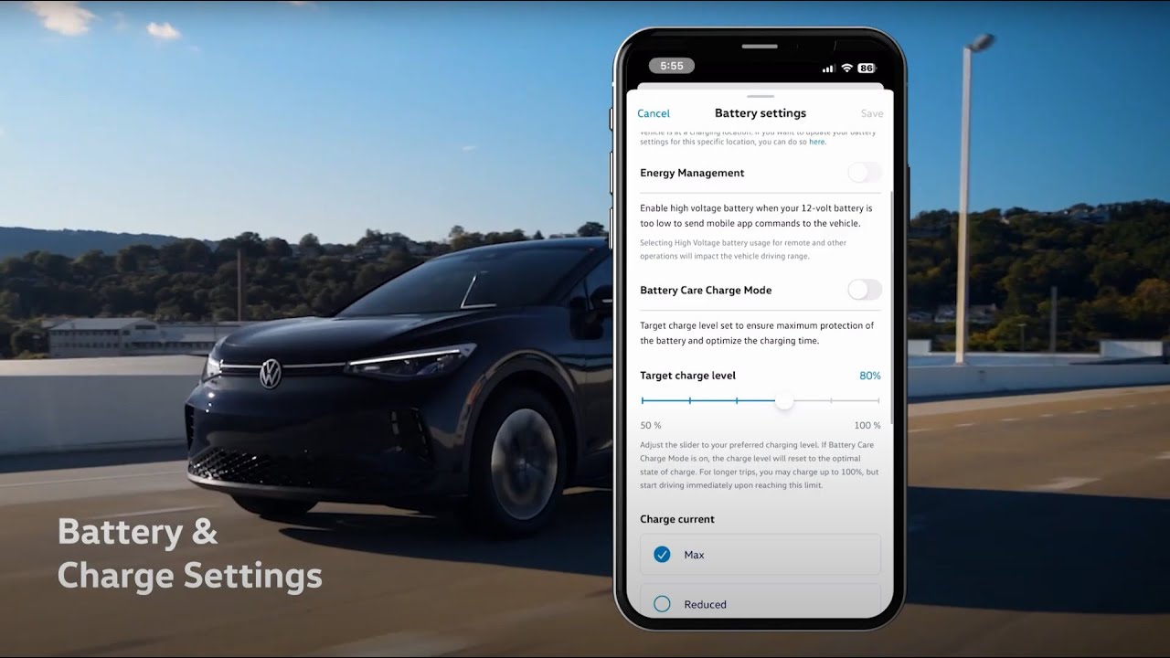 Maximize your EV experience with features like turning on Battery Care Mode, setting the target state of charge, reducing the AC charging current, and more with the myVW app!