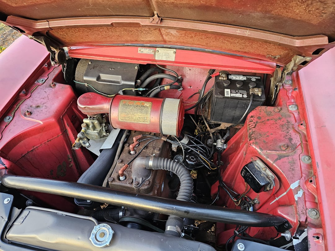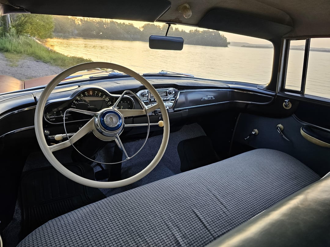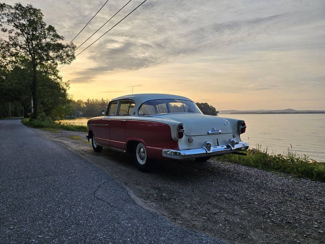 Paint has faded a bit but the original color is Nash Coral Red. Odd combo with the blue interior, but I like weird. Runs and drives 100% aside from the vacuum wipers and I’ve put 300 miles on it in 5 days. Engine is a 202 cubic inch Hudson Flathead 6 with a single barrel Carter carburetor and a Hydramatic transmission, and it has 50k original miles. Planning on having the original radio rebuilt over the winter. The original Weather Eye climate control works fantasically well