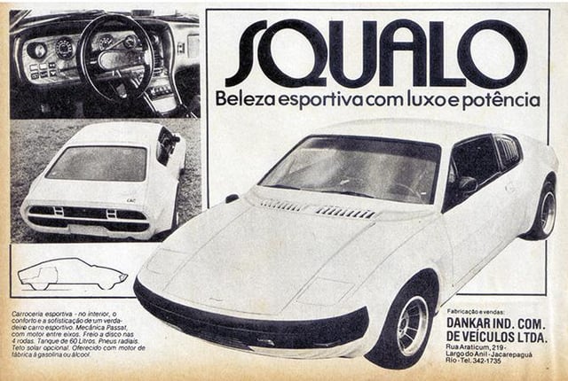 Squalo. One of the lesser-known models from the golden age of Brazilian off-road vehicles was born in 1979 in the Rio de Janeiro neighborhood of Jacarepaguá. The first version followed the old recipe of the time: addition of a fiberglass body, the mechanical assembly of air-cooled Volkswagens. It was simply named the Squalo, after the company that produced it: Squalo Indústria e Comércio de Veículos.