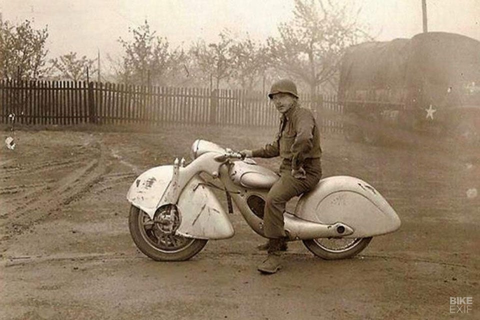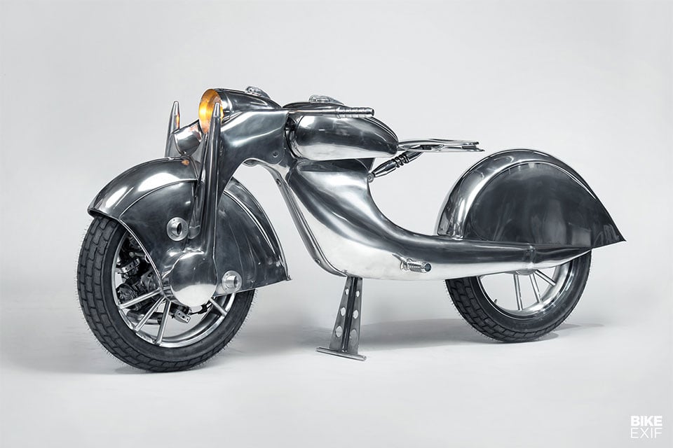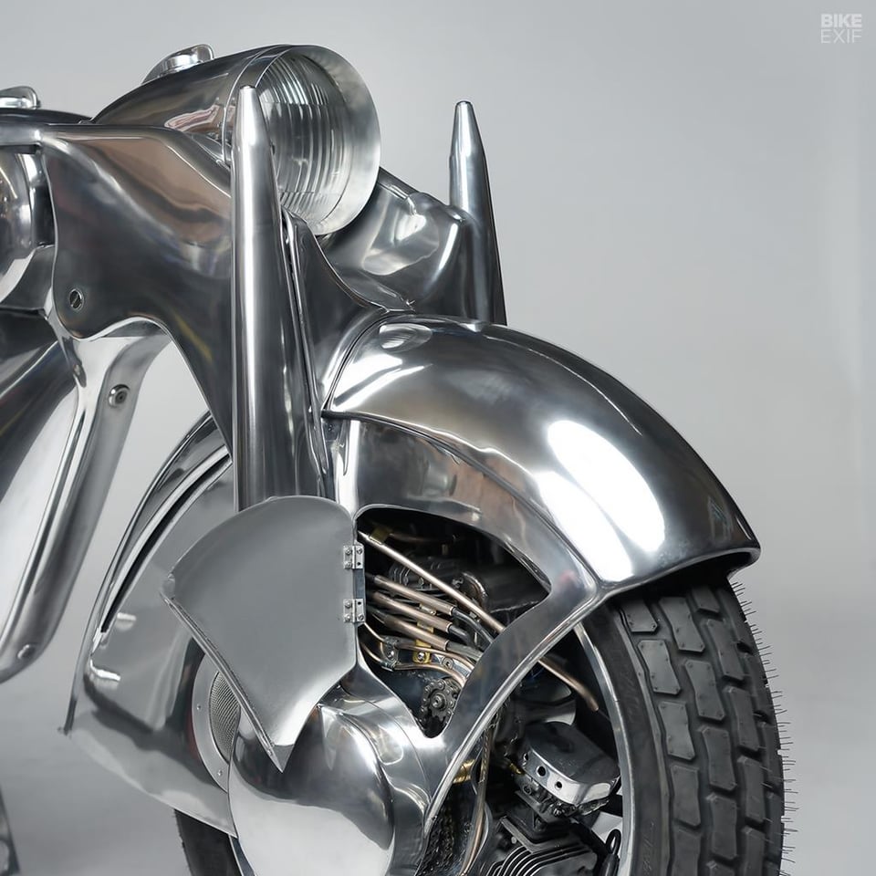Body work looks cool. Not really convinced about front wheel drive motorcycles. It doesn’t really work but it is a retro after all. Yep it would be a Killer that’s for sure but as a styling excerise it’s impressive.