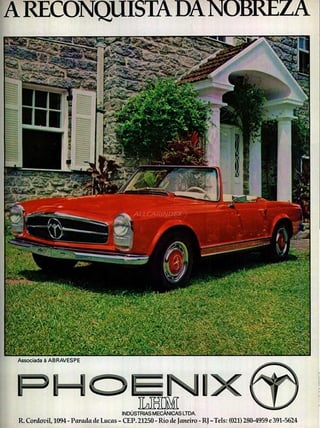In the same year, a coupe version was launched, following the same lines as the German model, as well as a convertible replica for children. In 1986, in addition to offering another version of the Phoenix, with a Ford V8 Windsor engine, LHM prepared a lighter tubular chassis, integrated into the fiberglass body, replacing the previous one, from the Opala.