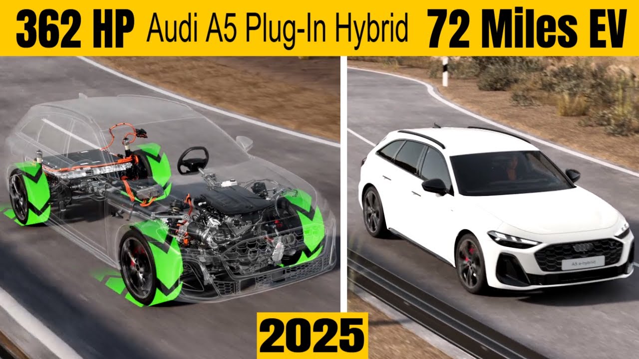 Audi is stepping into the future by replacing the A4 with a new plug-in hybrid version of the A5. Available in both sedan and wagon body styles, the A5 e-hybrid blends the efficiency of a 25.9 kilowatt-hour battery with a turbocharged 2.0-liter gasoline engine. You can choose between two versions: a base model with 295 horsepower or a more powerful version with 362 horsepower, matching the V-6-powered S5. The A5 e-hybrid offers an electric-only range of 72.1 miles and a top speed of 87 miles per hour in EV mode, making it perfect for daily commutes or weekend getaways. With an 11 kilowatt onboard charger, it can be fully charged in just 2.5 hours. In this video, we break down everything you need to know about the Audi A5 e-hybrid lineup and what could be coming next with a rumored RS4 plug-in hybrid.