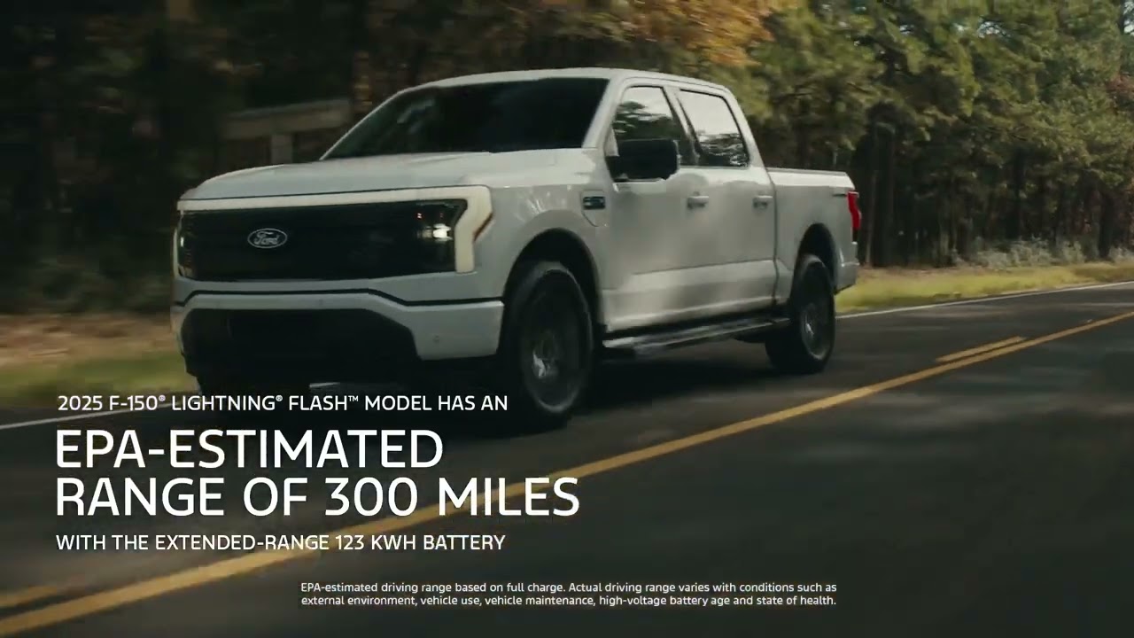 The all-electric 2025 Ford F-150® Lightning® Flash™ model has an EPA-estimated rating of 300 miles of all-electric range. DISC: EPA-estimated driving range based on full charge. Actual driving range varies with conditions such as external environment, vehicle use, vehicle maintenance, high-voltage battery age, and state of health.