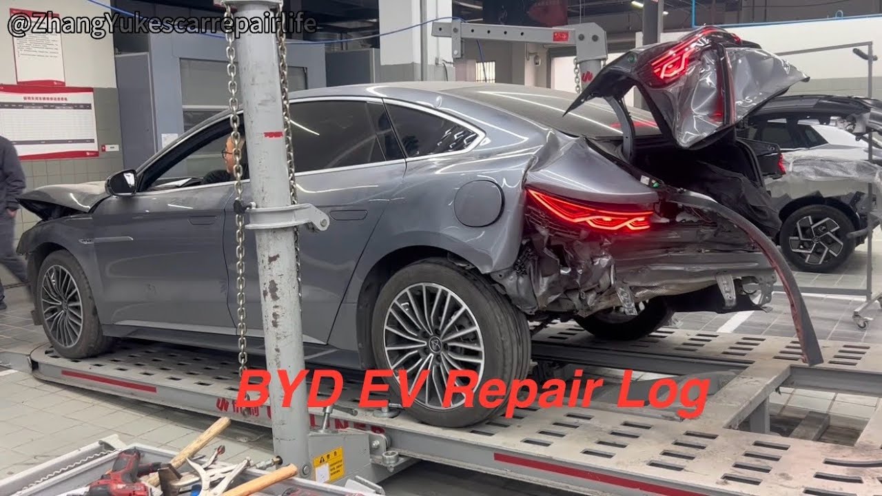 Hello everyone, today I’m bringing you the complete maintenance record of a BYD Han pure electric vehicle. This car belongs to my buddy, and I’ll be covering the repair process. The vehicle was involved in a front-rear collision: the front damage was minor, but the rear was severely impacted. I’ve documented the entire maintenance journey in detail—it’s packed with exciting and informative content, so I hope you’ll take the time to watch it through.