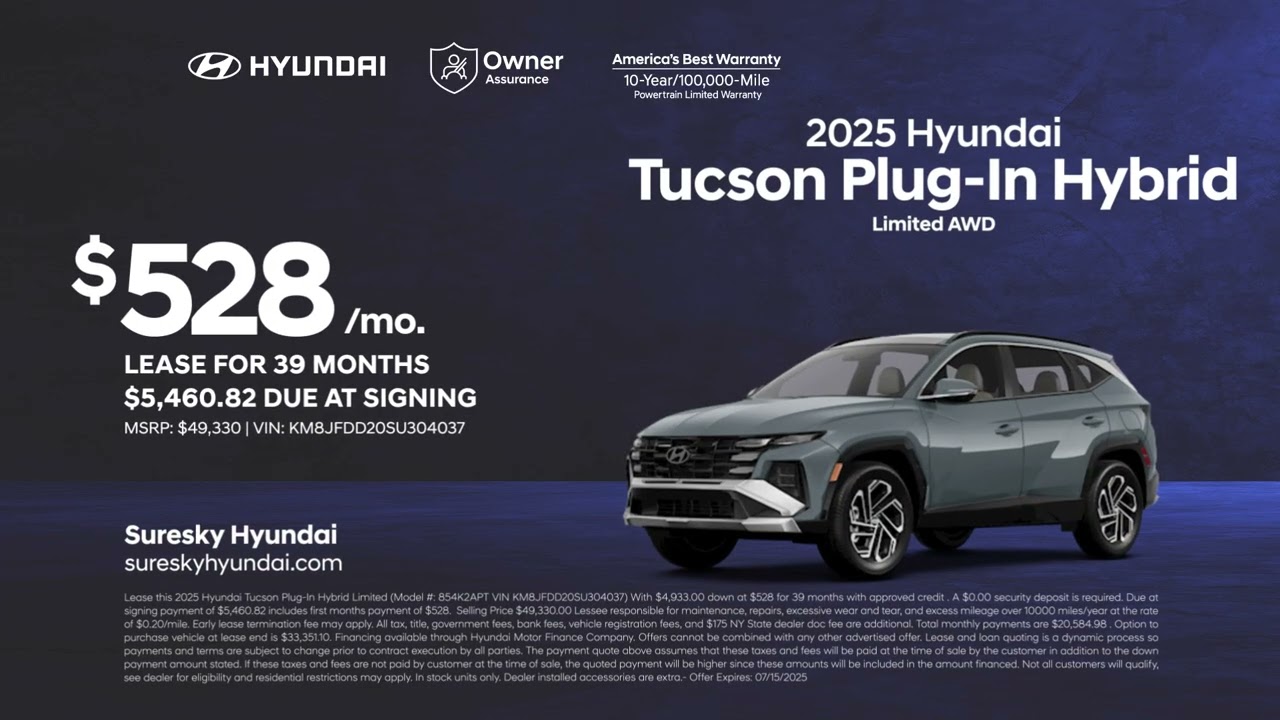 Discover your new Hyundai right now at Sureski Hyundai. Come lease a 2025 Hyundai Tucson plug-in hybrid for 528 per month for 39 months and experience America’s best warranty with Hyundai owner assurance. Visit Sureski Hyundai today.