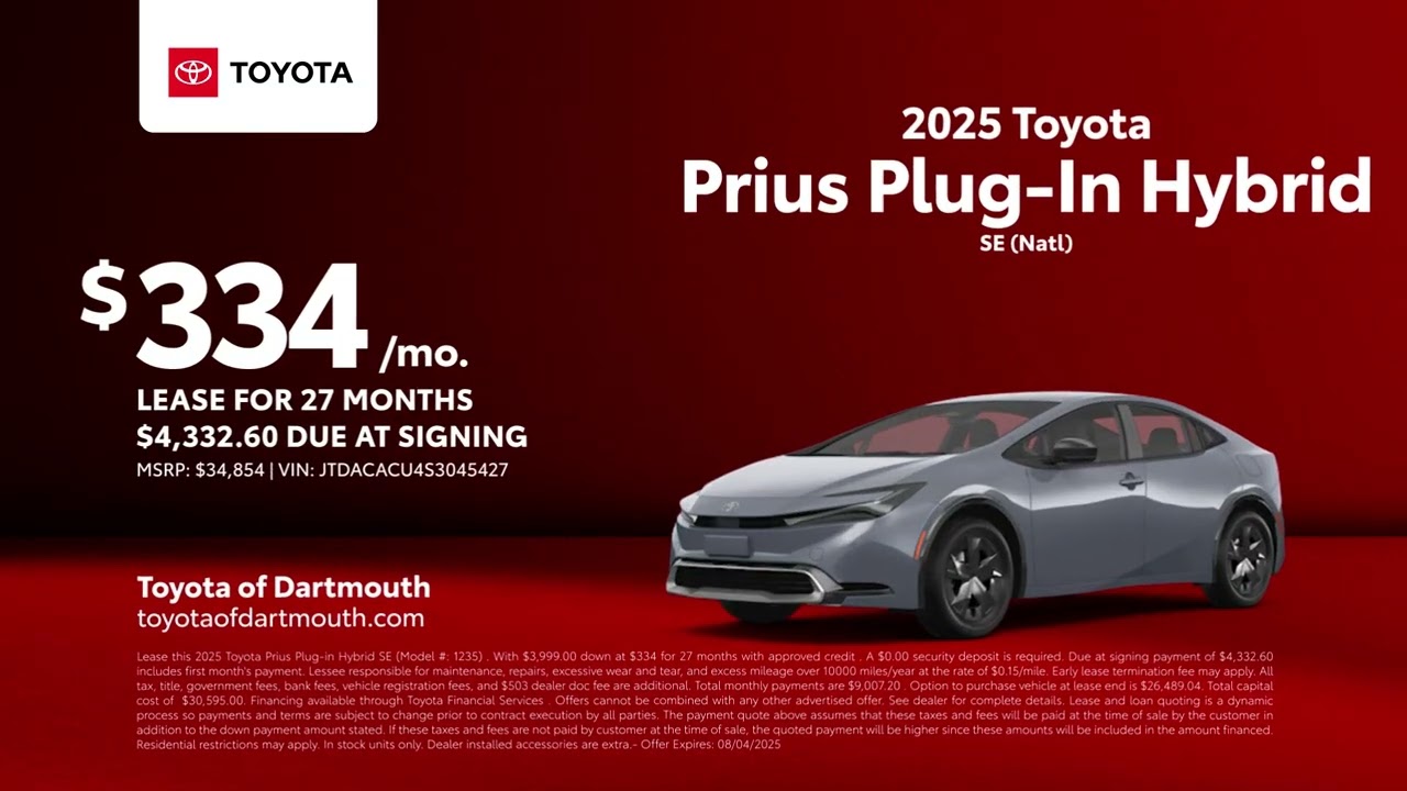 Toyota Prius Plug-In Hybrid 07/04/2025 5766727 Discover your new Toyota right now at Toyota of Dartmouth. Come see the latest lease offer on a 2025 Toyota Prius plug-in hybrid. The search is over. Visit us today at Toyota of Dartmouth. [Music] Electric CarsElectric VehiclesEVHybridHybridsPlug-in HybridsPlugInpriusToyotaRelated Posts 2025 Mazda CX-90 Plug-in Hybrid Prices, Reviews, and Pictures January 13, 2026 Europe Hybrid Cars Market Size, Share & Growth Report, 2033 January 13, 2026 2027 Volvo XC60 Hybrid Review, Pricing, and Specs January 13, 2026 Stellantis Kills Full Plug-In Hybrid Line, Including America’s Top Selling PHEV January 13, 2026 Stellantis Pivots From PHEVs to Hybrids and EREVs in North America – January 12, 2026 January 13, 2026 Stellantis Discontinues Its Entire Line of Plug-in Hybrids January 13, 2026