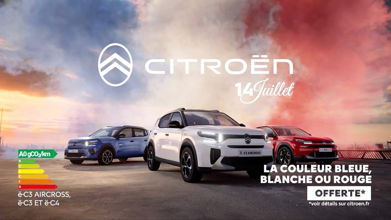 Dans votre point de vente Citroën, à l’occasion de la Fête nationale, la couleur bleue, blanche ou rouge est offerte pour l’achat d’un véhicule.