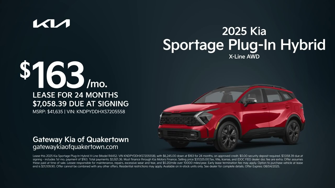Discover your new Kia right now at Gateway Kia of Quakertown. Come lease a 2025 Kia Sportage plug-in hybrid for 163 per month for 24 months. The search is over. Visit us today at Gateway Kia of Quakertown.