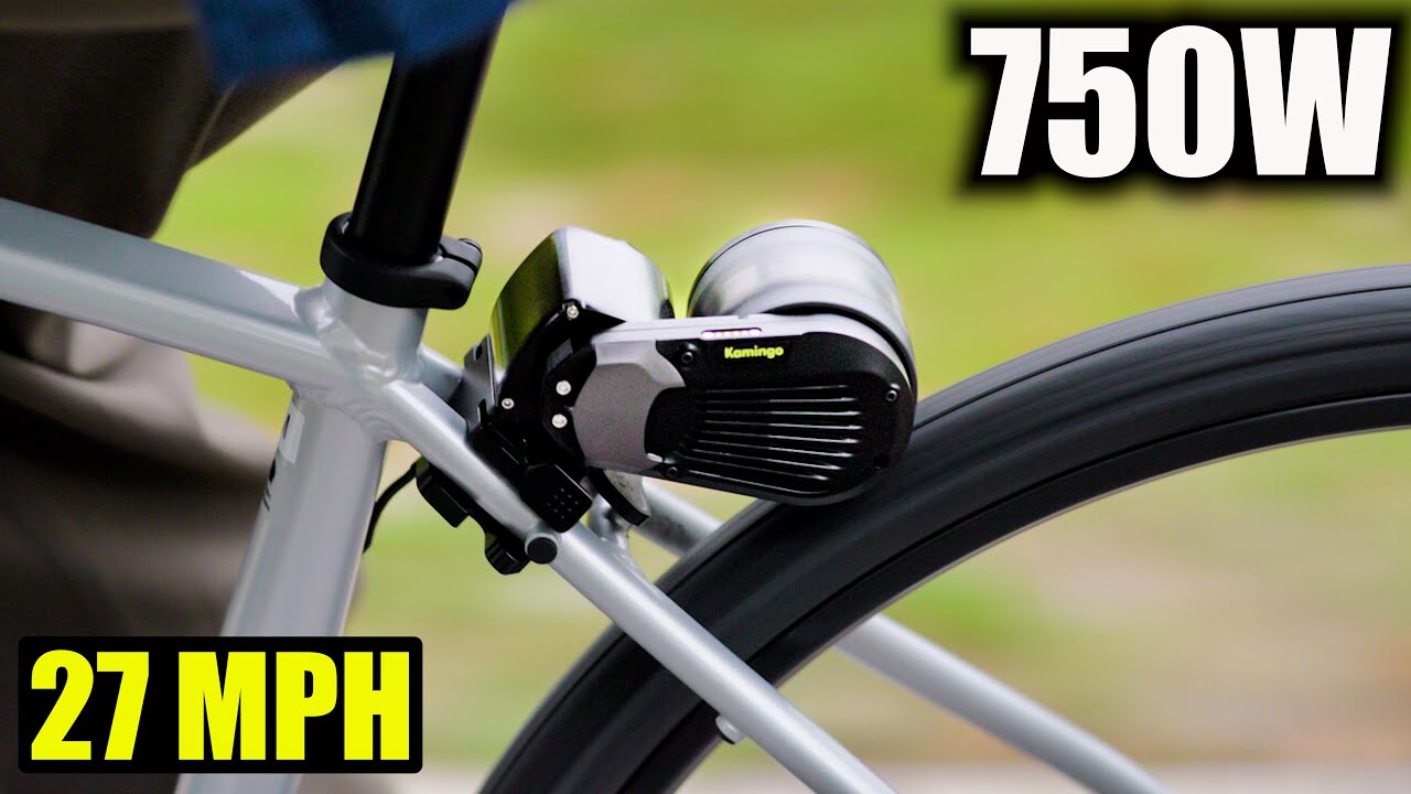 Guys, I have something super crazy for you today. This kit is insane. This is now on the Kickstarter and it sells for $349. So, out of the campaign, it’s going to cost $589. And you have here the battery. The motor looks crazy compact, brushless, feels very light. For a prototype, looks really wellm made with this bracket enclosure. Very interesting. Looks looks good. And has this nice cover here. Doesn’t splash you. I don’t know how much it weighs, but it’s super light. So, this is 750 W. Big power. Nominal 250 W. And it takes about 10 seconds to install on your bike. Like, this is super tiny. The motor weighs 920 g. That’s 2 lb. The battery 1.4 kg, that’s 3 lb. The entire system only weighs 5 lb. No wires, just connects to the battery and the controller. And that’s pretty much all the kit. So, $350. Yeah, this is the mount here and this is the controller. Everything is super compact. It’s well packed, but I believe this is not the final packaging. This is the prototype and this is what you get in the kit. So, the battery with the mountings that goes into a frame. You have this also ultra compact Allen wrench set keys, the charger, and I have the European plaque. So, I have to cut this out and put US plug. You get two Velcro ties hardware. In this kit, you’ll only get one cable that connects the motor to the battery, the mount and the sensor that mounts onto the pedals, the controller, and the motor. This is insanely compact motor and the craziest ebike kit I’ve ever seen. It is extremely light with the mount. The design and the housing plate that covers the drive and the mount is very futuristic, super minimalist. Execution is phenomenal. I hope it works as good as it looks. And this is a prototype. I cannot wait to see and try the final version. It’s going to be so much better. This is just incredible. [Applause] [Music] On flats, it gives you a lot of boost. You can feel the kick and allows you to go way faster compared to a regular non-powered bike. You have different modes that allow you to tune, adjust the power output, and feel that natural pedaling feeling. or if your tire just cruise and not sweat and let the motor take over the bike. It is not a full power 750 watt output, but you get here an assist system that on flats and decline will give you enough power to ride fast. I would compare it to 500 W hub motor. But once you reach a steeper hill, the power output will reduce and the motor will struggle and will slow down to a stop if you don’t paddle. With paddling, getting over the hills, it’s so much easier. [Music] Okay, the bike shows now 15 miles an hour with the throttle engaged, I can actually climb 16 going uphill. Let’s say if I remove it 17. Yeah, much harder now. And the speed is dropping. I have to shift up. Yeah, the kid is actually look now 12 11. So the kid really makes a difference. Now if I push it back, it’s going to take a little bit but gradually. Comes back now. 13. So, it’s a slower, you know, gain, but it’s a very small motor. Once you’re back on the flats, the motor kicks in full power and lets you build up speed faster and assists more. It feels like the motor is limited to give you the best possible performance without overheating and all other issues that comes with it. I don’t have regular bikes. All my bikes are electric. And this kit actually fits here. I put a longer bolt. And here because the design, it’s uh pushing through. Has this like little tongue sticking out. So I put this plastic uh spacers here. You can actually uh cut aluminum plate that goes around and DIY. It’s very easy, very simple. I found this like a round length and I put them here like in 20 seconds. I was able to mount the kit. Lines up perfectly with the wheel. It’s super sturdy. It doesn’t move. And I have over 50 miles so far on both bikes and it works flawlessly. And uh here the what they can do, they can cut this flat. So the base it’s flat sitting on the frame and it will fit even more frames. But you can see to install they say 3 minutes on the website. It took me probably less than 2 minutes. You just put the the water ball cage here. Two screws to connect. I rub the wire around. I don’t have to use any velcro, any zip ties. It comes here. It has magnetic charger and magnetic connection. This is the only wire that connects to the motor to get the power. This module, it’s uh Bluetooth connected. So, this thing, look at this. You just take it outside and you can style on any handlebar. It’s a prototype. The action, if you push here, you see like it doesn’t go all the way down. It’s a little um flims finicky, but it’s working. You can just push and mostly from half to top. That’s where you get all the response from the from the motor. And it’s really really for what it is, for the size and for rating 250 watts. It’s actually very powerful. You can feel I’m pushing 14 m an hour. I just push this and goes to 17 and then gradually uh and it’s not slow. It goes to 23 24 mph. And this is on your bike. So I had this turned off and you have resistance. And with resistance, it actually goes 23, 24 mph, comfortable pedaling, and I’m carrying extra weight of the battery and the motor. You remove the battery and the motor on the regular bike, and you get so much more performance, more range, and plus I’m 225 lbs. So, if you’re lighter rider, you’ll get even better performance. This entire week, I’ve been playing with this super compact, tiny motor. And since we talking about very compact things, I want to introduce you today to really tiny, the smallest X1 bike air pump I just got. And this thing is just so much smaller compared to previous one that I’ve been uh using for CY Cycle. Let’s open this up and let’s compare them in size, but this has the same features, but even smaller. So, it’s APX1 bike air pump and you have here the branding and all the features, the same features you see in all other
