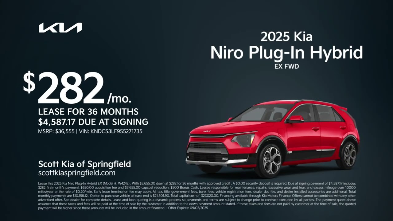 Kia Niro Plug-In Hybrid 08/06/2025 5924200 Discover your new Kia right now at Scott Kia of Springfield. Come lease a 2025 Kia Nero plug-in hybrid for 282 per month for 36 months. The search is over. Visit us today at Scott Kia of Springfield. Electric CarsElectric VehiclesEVHybridHybridskiaNiroPlug-in HybridsPlug-in Hybrids VehiclesPlugInRelated Posts North America PHEV Market to Reach US$ 84.24 Billion by 2033 January 12, 2026 BYD’s Denza Z9 GT three-motor output rises by 188 hp to 1,140 hp January 12, 2026 The Everyday Hybrid That Finally Makes Electric Driving Easy January 12, 2026 The Calm, Clever Answer to Range Anxiety in 2026 January 11, 2026 Chinese firm launches hybrid EV with 1,000-mile range, 165 kW motor January 11, 2026 Buick Electra E7 EREV goes nearly 1,000 miles January 11, 2026