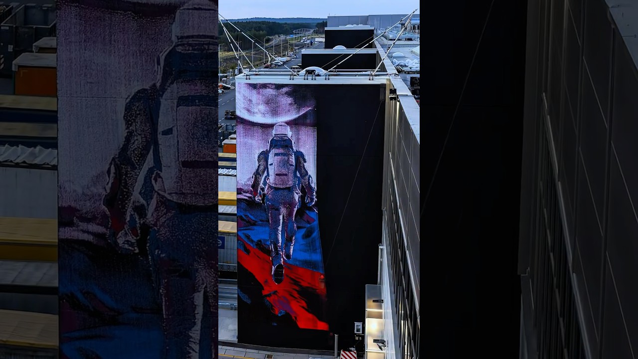 So, at first we started with some local graffiti crews, but then we realized that to cover the entire factory with art, we had to also leverage uh technology cuz this is Tesla obviously. So, we found a robot muralist. So, one of a kind startup that developed a graffiti printer. Together with them, we were able to also get digital artworks printed on our factory walls. And so we curated some from artists around the world but also did a lot of the artworks ourselves in house. So the robot uh consists of two parts. One is the the print head is and the lifting mechanism. So this is this is the lifting mechanism just winding two of these kevlar cables so that the robot can move directly up and down. Basically a triangulation method. The paintings they compose of of these little dots, right? So we have about 10 million dots of one wall. Uh and and this whole west side is composed of about 300 million dots of paint. Each wall has five different colors. The print head has 12 cans of paint on board. Yeah. And and the paint is shot uh underneath here. So these these little holes, they they shoot the paint. the the propellers are just to give a little bit of push towards the wall uh so it wouldn’t swing away. And this red light, this is the the tracking target for for the camera. We get a lot of inspiration from Berlin, but also from Tesla’s product and the factory itself. I mean, it’s the machine that builds the machine, and it’s it’s a very inspiring place. So, all of the artworks take different aspects from from the local spirit. And uh there’s still so much left to do. Um we’re far from done.