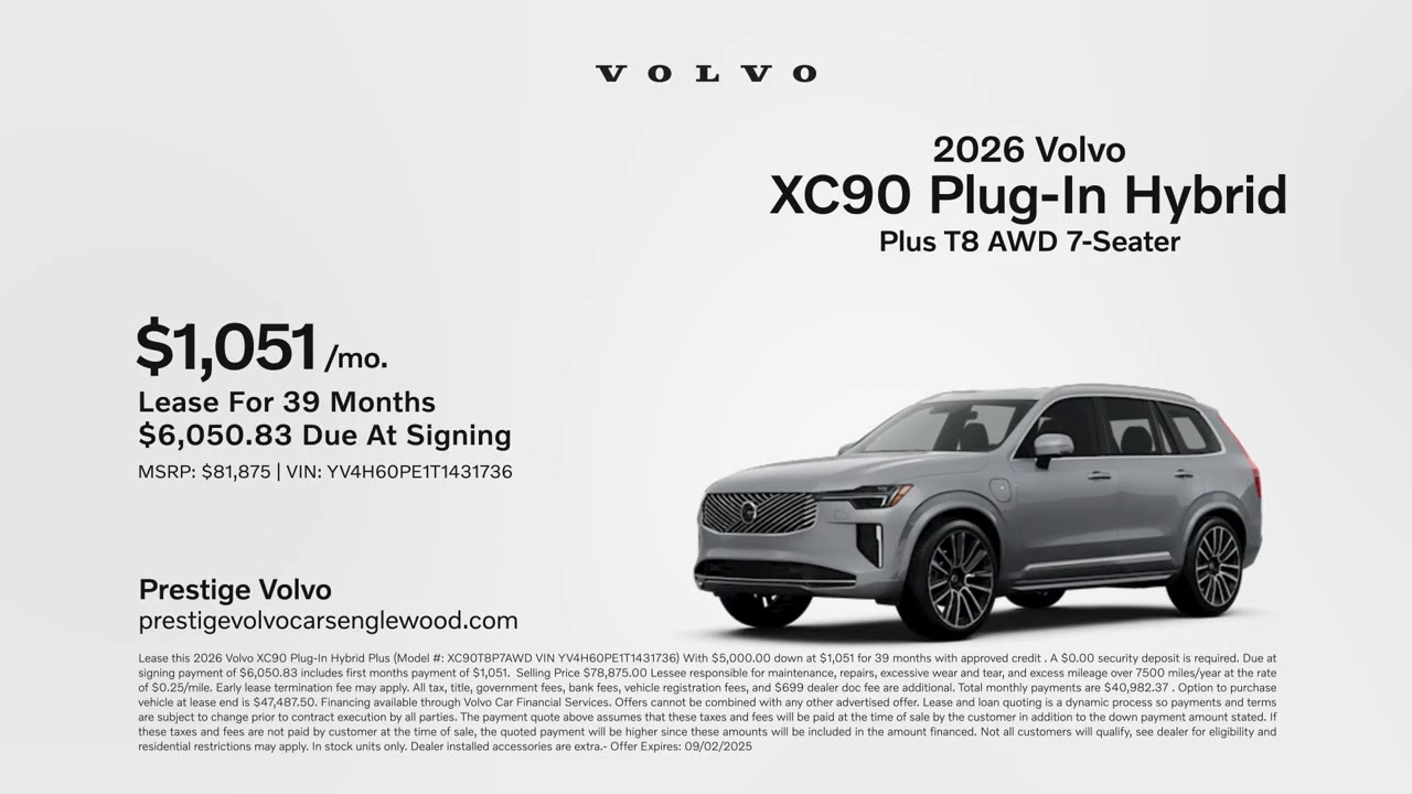 Volvo XC90 Plug-In Hybrid 08/15/2025 5976493 Discover your new Volvo right now at Prestige Volvo. Come lease a 2026 Volvo XC90 plug-in hybrid for 1051 per month. The search is over. Visit us today at Prestige Volvo. Electric CarsElectric VehiclesEVHybridHybridsPlug-in HybridsPlug-in Hybrids VehiclesPlugInvolvoxc90Related Posts BYD’s Denza Z9 GT three-motor output rises by 188 hp to 1,140 hp January 12, 2026 The Everyday Hybrid That Finally Makes Electric Driving Easy January 12, 2026 The Calm, Clever Answer to Range Anxiety in 2026 January 11, 2026 Chinese firm launches hybrid EV with 1,000-mile range, 165 kW motor January 11, 2026 Buick Electra E7 EREV goes nearly 1,000 miles January 11, 2026 Buick Electra E7 EREV goes nearly 1,000 miles January 11, 2026