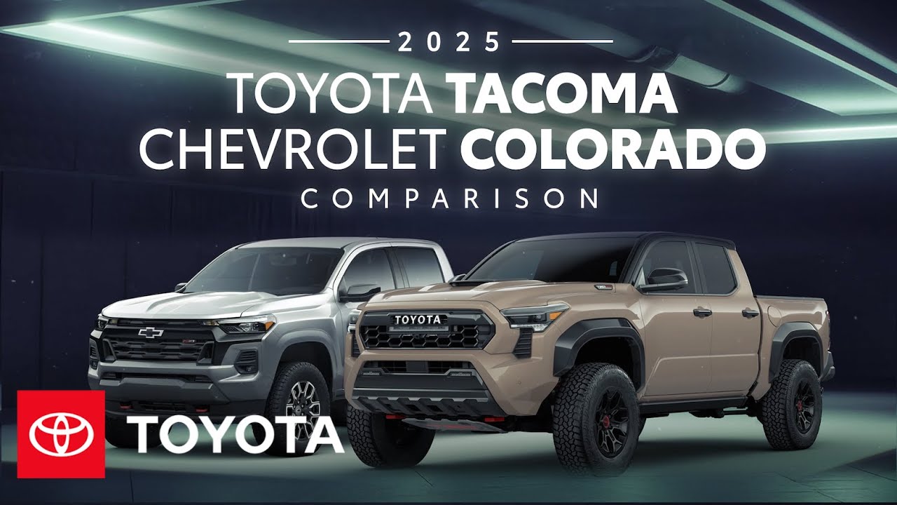The 2025 Toyota Tacoma versus the 2025 Chevrolet Colorado. Let’s find out which of these two pickup trucks offers the best blend of versatility and capability. Tacoma’s extensive lineup offers four off-road performance grades, which is more than what Chevrolet Colorado has. The available I Force Max hybrid powertrain gives Tacoma a power advantage versus Colorado. Tacoma’s two bed lengths and two cab styles mean more customizability than Colorado. Now, let’s put Tacoma and Colorado side by side. Tacoma’s eight grades include four TRD models, a choice between two bed lengths and two cab styles, and an available hybrid powertrain. Chevrolet Colorado is only available in five grades, and they’re only offered in one bed length and cab style. Tacoma’s capability really impresses. This starts with the I Force turbocharged engine with up to 278 horsepower and 317 lb feet of torque. Colorado comes standard with the Turbo Max engine with 310 horsepower and 430 lb feet of torque. There’s also an available Ice Max hybrid system with up to 326 net combined horsepower and 465 lb feet of torque. something that the Chevrolet Colorado doesn’t match. Tacoma pairs its power with off-road tuned suspensions featuring Billilstein shocks on TRD off-road, Old Man Emu shocks on Trail Hunter, and Fox shocks on TRD Pro. Colorado has a 2-in lift on the Trail Boss, and up to 3 in on the ZR2, which also comes with multimatic shocks. Tacoma also offers a stabilizer disconnect mechanism on select grades for additional off-road performance. while its limited grade standard adaptive variable suspension and available fulltime four-wheel drive system bring added on-road refinement features that Colorado lacks. Finally, Tacoma has up to an EPA estimated 23 MPG combined rating, while Colorado has up to an EPA estimated 20 MPG combined rating. Tacoma’s modern, rugged design blends style with function. This starts with available 18in alloy wheels and standard LED headlights, the latter of which is only included on select Colorado grades. Tacoma’s standard deck rail system also brings added versatility over Colorado where the reconfigurable bed rails are optional. Additionally, Tacoma’s 120 volt AC power inverters, which are rated for 400 watts in gas grades or 2,400 watts in I Force Max hybrid grades, give owners added flexibility for powering devices. Colorado’s available 120 volt box mounted power outlet maxes out at 400 W, which is similar to Tacoma’s gas grades, but can’t match the higher output of the 2,400 watt inverters on the I Force Max hybrid models. Tacoma’s impressive functionality is accentuated with an available power tailgate and available power extending running boards. Colorado has two available tailgate options, the easy lift and lower and stolex tailgates. It also offers available black assist steps as well as fixed or removable running board options. When it comes to comfort, Tacoma really delivers thanks to features like its available dual zone automatic climate control system. Colorado also offers available single and dual zone automatic climate control on select brakes. Both trucks further enhance comfort with available heated and ventilated front seats and an available heated steering wheel. And the TRD Pro’s ISOnamic performance front seats use a shock absorber system to further smooth the ride, a feature Colorado doesn’t offer. On the other hand, both Tacoma and Colorado have an available chi compatible wireless charger that’s designed to help keep mobile devices topped up on the road. Tacoma even has an available 12.3 in digital gauge cluster, which is larger than Colorado’s standard 11in driver information center. Tacoma ups the Annie with an available head-up display that’s designed to put key information in the driver’s line of sight, something that Colorado does not offer at all. In terms of audio multimedia, Tacoma has a standard 8-in touchscreen and an available 14-in unit. Colorado comes standard with an 11.3 in touchscreen. Tacoma’s interface includes standard wireless compatibility for Apple CarPlay, which connects drivers to the apps on their iPhone, including maps, messages, podcasts, and music subscriptions. In addition, wireless Android Auto compatibility makes it easy to stay connected to Android devices and access various apps and services from Google, including YouTube Music and Google Maps. Plus, there’s a standard 3month Sirius XM trial subscription that includes over 165 channels available in Cabin and even more on the Sirius XM app, making it easier than ever to enjoy not just adree music, but also sports, comedy, and more. Colorado also includes wireless compatibility for Apple CarPlay and Android Auto, as well as a Sirius XM trial. Select Tacoma grades also include trials for Toyota’s line of connected services, including Safety Connect, Service Connect, Remote Connect, Wi-Fi Connect, and Drive Connect. Colorado has available OnStar services trials on select grades. Finally, Tacoma has an available 10 speakeraker JBL premium audio system, which includes a portable JBL Flex speaker that lets drivers take their tunes on the go, a feature that Colorado’s available 7 speakeraker Bose premium audio system just can’t match. [Music] All Tacoma grades come with the Toyota Safety Sense 3.0 system. This includes a pre-colision system with pedestrian detection, lane departure alert with steering assist, automatic high beams, full speed range dynamic radar cruise control, lane tracing assist, road sign assist, and proactive driving assist. Colorado offers similar features as part of the Chevy safety assist suite. A panoramic view monitor is available on both trucks. Tacoma’s off-road grades include the multi-terrain monitor, while Colorado’s equivalent models have a similar feature. Plus, Tacoma has available front and rear parking assist with automatic braking, while Colorado only offers rear parking assist and rear cross traffic b
