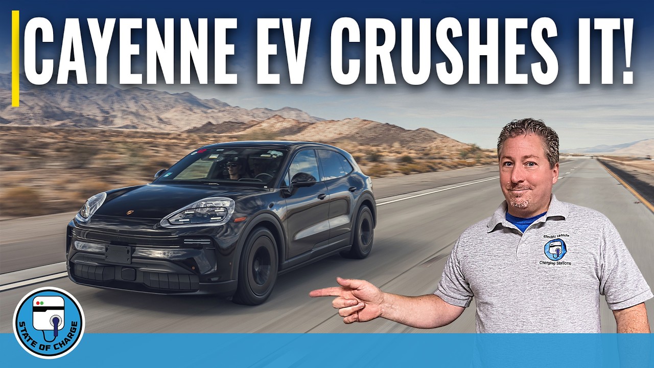 I’m going to take that mile an hour advantage over Kyle because I started out with the disadvantage of having the off-road package. So, so that should have been my handicap anyway. So, there we go. There we go. Hello from almost sunny Southern California. I’m out here for a very special event. Behind me, you can see there are three Porsche Cayenne EVs and myself, Kyle Connor from Outer Spec and M. Hogan from Inside EVs were selected to be the first three people to drive the Cayenne EV on US soil outside of Porsche employees. Obviously, we’re going to be doing a range test today. The three of us are going to be hopping in these cars and driving them out into the desert. We had to find a route that wouldn’t be too much traffic. It’s hard to do that in California, but I think we have one. We’ll be we’ll be able to drive pretty much 70 m an hour uh for the whole day. and we’ll see just how far the Cayenne EV goes. Now, it’s not EPA range rated yet. It’s not available yet. It’s not going to go on sale in the US for another 7 or 8 months. Uh so, there’s a little bit of time for that. And these are prototypes, but Porsche did tell us that they’re very close to production. They have the production tires on them. And uh what we get here today, they feel is representative of what the uh Cayenne will get in real world tests for production vehicles when they’re in customers hands. Range tests are always different. I say this every time I do a range test. You could drive a vehicle on 10 different range tests and get 10 different uh results. But uh here today, we’re going to take these out and uh see what it gets in the conditions we have today, which I’ll talk about as we’re driving. This is not a standard 70 mph range test like I usually do. The route has a lot of elevation change, which is going to hurt the results. We’re going to be climbing, I think, 1,600 feet and then descending that much. So, we will get a little bit back in that. But, uh, it’s it’s not like the basic 70 mph range test that I usually do where everything’s controlled. But, this is going to be a good, uh, representation of what, uh, Cayenne EV owners will see in the real world in similar conditions, which we’ll talk about once I get in the car. So, with that said, we’re just about ready to take off. The three of us are hopping in our respective cars. We have Porsche representatives in the vehicles to talk to us about the vehicle, which you’re going to see uh, really soon. We’re going to talk to uh Porsche reps while we’re driving and uh see exactly how far the Cayenne EV will go uh at roughly 70 mph in the conditions that I’ll describe in a few minutes. So, let’s get into it. [Music] All right. So, I’m out on 10 East heading towards the desert cruising in the Cayenne at 78 mph. I’m here with Marco Schwerbeck from Porsche and also another PCNA colleague in the back, but I’ll be talking to uh Marco uh most of the time here today. Uh before we get into that, first of all, thanks for coming on. I appreciate it. Um uh let’s talk a little bit about this range test cuz it’s different than the range tests that I typically do. I typically do 70 mph highway range tests and I control as many variables as I can. I do them on New Jersey Turnpike where there’s no elevation change. I try to pick days where there’s not a lot of wind, where the temperature is just right. Uh but uh out here because this was such a special occasion, we have a set course. The day was the day. Although the weather’s actually pretty good out here today. We’re uh in the 70s already. It’s going to probably get up to about 80°. So pretty good range weather. However, the course we’re on is anything but flat. Uh we’re we started off at an elevation of about 1,200 ft and we’re going to climb up to like 2600 ft. So we have about a 1,400 elevation climb and then we go down to sea level and then we climb back up to 900 ft I think or actually 1,700 ft uh before going down to 900 ft and then turn around and come back. So uh this that’s going to have an effect on the Cayenne. We’re not going to see the consumption rate that we would see if we were on, let me fix this now, a flat surface. So, I would speculate after looking at this uh map of the elevation that we’re going to be going here today, I’ll probably be able to go at least 20 m farther if I was on flat uh ground with the the Cayenne. So, we’re going to take that into consideration. We’re in the climb right now. And I can tell you up until the point where we started to climb, I had a 3.1 m per kowatt hour consumption rate, which is similar to Macan EV. When I did the 70 mph highway range test, I was surprised we were doing so well at 70 mph. But now that we’re in the middle of this monstrous climb, we’re down to 2.5 m per kilowatt hour. So this 1,400 uh foot elevation climb is taking its toll on the Cayenne. And let me get over here because I want to pass this truck and stay at 70 mph. We’re trying to maintain 70 mph. Uh it’s it’s been a little challenging, but uh for the most part, I’ve been at 70 mph and I actually have a recording of the speedometer that I’ll be able to put in the video later on. So, you’ll be able to see exactly how much of this trip we did at 70 mph. So, uh Marco, listen. Uh thanks for doing this. I appreciate uh the opportunity to have uh uh me, Mac, and Kyle be the first three uh Americans outside of Porsche to drive this vehicle on US soil. Uh my first question for you is um you know, Porsche does so well in my opinion with efficiency considering it’s such a power such powerful vehicles. Every time I do a range test with a Porsche, it far exceeds its EPA range rating. It’s the only manufacturer that every time I drive it at a 70 mph um range test, it beats the EPA range rating by anywhere between 9% and 15%. Um what’s what’s the secret sauce? Oh, there are not the one secret sauce