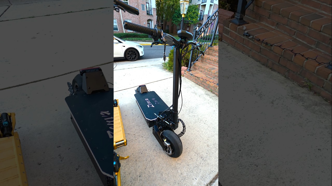 These are very fast scooters. The Vostto V1, it’s insane. Another level of speed and power delivery. But today, we just got the new Zenva dash. This is a really fast racing hyper scooter. Look at the motors and the body. It’s just built for speed. Also, look in the front here. We have PMTs, have good brakes, two steer dampeners, and guys, full video coming soon. This thing is just powerhouse and probably the only one scooter that can probably give Vast trouble. Maybe head to head, maybe even faster. We’ll see in a full video. But check this out. Needs to be charged. And here when you go on the menu has two motors showing you the maximum power speed. And if you go here, actually, let’s see here. shows the temperature per motor, controller temperature, bus voltage, a lot of cool stuff. Lap time, and look at that really nice screen. So, this scooter can be the only one that can go head-to-head to Vasto. Maybe a little slower, maybe even faster. We’ll see. But very important, Vastto is not a scooter designed for speed. This designed for comfort, for long range, for performance, but in a different way. This thing just looks like it wants to go fast. Very sturdy handlebar. Look at this design. And it’s very short. So you have to like tuck in, go low, and really go fast. This thing is just, look at the body. It just screams speed. So guys, full video coming very soon. Stay tuned.