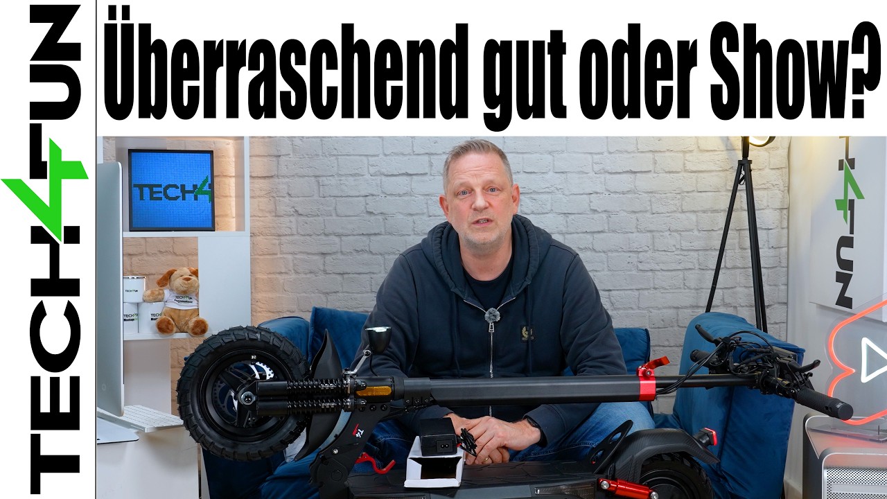Das Fahrwerk hinten macht einen sehr guten Eindruck. Vorne muss ich sagen, ist es deutlich zu hart. Deutlich zu hart. So und du wolltest du nicht, du hattest doch einen Witz. Ach, den hast du schon erzählt. Der war so schlecht, dass ich das vergessen habe, dass du den schon erzählt hast. Schönstes Wetter, Sonnenschein. Es sind, ich schätze mal, 15, 16° und der Horst hat Handschuh an und ein Mützchen. Nein, wirklich, ich komme nicht drüber hinweg. Ich komme nicht drüber hinweg. Ich mag ich mag dich ja trotzdem gern. Siehst du was, Karsten? Ja. Was denn? Keine Bremslichtfunktion. Wirklich? Da muss ich ganz ehrlich sagen, Freunde von Eisgoter, dass ihr hinten keine Blinker einbaut, okay, aber kein Bremslicht, kann ich nicht verstehen, da muss ein Bremslicht. Vollfederung, vorn und hinten Scheibenbremsen, 600 Wattstunden Akku und 1000 Watt Peakleistung. Der Eisgoooter T4. Was denkst denn du für was für eine Zielgruppe ist den der? Man guck nicht wie eine Kuh, wenn es donnert. Eine normale Frage. Der Stuhl ist nicht auszahl. Ich will ein Regiestuhl. M immer dieses das ist wirklich das ist jetzt Fips Asmus excellence und Stuhl in auf irgendeiner Bühne in Kastroprauxel. Entschuldigung liebe Einwohner von Gast. Nein, wirklich. Aruis heißt das und bitte sprich nicht bayerisch, weil das kannst du nicht. Ich kann es auch nicht, darum mache ich es nicht. Und du kannst auch nicht lustig sein und du kannst nur Fips Asmussen sein. Aber jetzt hör doch mal auf. Für was für eine Zielgruppe ist der? könnte der sein für die Zielgruppe der einbeinigen Elefanten. Ich will ich will das auch nicht mehr. Ich will ich will es nicht mehr. Na ja, für die Leute, die ein bisschen ins Gelände möchten und ein bisschen verlaben möchten. Hallo und herzlich willkommen auf Tech for fun. Heute dabei der Carsten und ich bin Boris und ich freue mich, dass ihr auf dieses Video geklickt habt. Ja, neben ganzen Ulk und lustigen Fips Asmusen Style haben wir hier den Eisgoter T4 Karsten. Ja. Wozu bist du eigentlich der Montagehost von Tech for Fun, wenn du fast gar nichts mehr montierst? Ja, meine Daseinsberechtigung hat stark nachgelassen. Ich habe mit meinem Therapeuten darüber gesprochen und der sagt, alles wird wieder besser. Okay. Nein, aber wirklich, du hast hier nichts zu montieren. Was mir aufgefallen ist, die Bedieneinheit, die ist ein bisschen locker, die muss festgeschraubt werden. Das war’s nichtmals. Das Vorderlicht. Ja, aber trotzdem müssen die Schrauben kontrolliert werden, denn die Sicherheit geht vor. Ja, und bei jedem neuen Gerät, was ich kaufe oder teste, möchte ich, dass die Schrauben kontrolliert sind. Ja, das finde ich gut. Tatsächlich finde ich das gut. Solltet ihr auch machen, wenn ihr einen neuen E-Soooter bekommt, euch den bestellt habt, checkt einmal die Schrauben, weil das haben wir wirklich erlebt, selbst bei Premiumherstellern und ESTern deutlich über 1000 € war die eine oder andere Schraube nicht wirklich fest. Also, das sollte man auf jeden Fall machen. Boris, ja. Ich finde ESTER sind ein bisschen wie Frauen. Oh, krassen. Wir wir sind 2025. Man darf nichts frauenfeindliches oder sexistisches. Bitte nicht. Das ist nicht sexistisch. Okay. Also, ich finde Egooter sind ein bisschen wie Frauen. Wieso? Erst sind sie voll geladen und plötzlich sind sie weg. Ich will es nicht mehr. Ken, ich sag dir eins, unter diesem Video bekommen wir garantiert wieder Kommentare. Ja, ist alles schön und gut, aber eure Witze, das ist ja echt Bauerntheater und ganz schlimm. Und soll ich dir eins sagen, ihr habt recht. So, aus der Verpackung haben wir rausgeholt, den Eisgoter T4. Kam sehr, sehr gut an, ordentlich und sicher verpackt. Allerdings ganz schön viel Styropor. Da würde ich mich freuen über eine etwas nachhaltigere Verpackung. Dann schauen wir mal an. Das finde ich immer eine schöne Idee. Hier gleich eine kleine Scootertasche dabei und dort ist mit höchster Wahrscheinlichkeit jetzt bist gespannt, nicht? Guten Abend das Ladegerät dabei und jetzt schnacken wir auch nicht lange rumcasten. Ich blicke einmal rauf. Blick, blick, blick. Und du sagst, wie viel Ampere Ladestrom? Zwei. Richtig, 2 Ampere. Damit ladet ihr den T4 in ca. 4 bis 5 Stunden von leer auf voll wieder auf. Das System läuft auf 48 Volt und der Akku hier unten im Trittbrett hat eine Kapazität von 12,5 Amperestunden. Das sind umgerechnet 600 Wattstunden und der Hersteller sagt, die Reichweite 60 bis 70 kg. Dazu muss man sagen ganz klar, das sind natürlich Laborwerte. Fahrerwicht um die 75 kg, warme Temperaturen, kein Gegenwind und so weiter. Karsten, ja, das wird das ist unbequem, Karsten. Das ist noch unbequemer. Das ist doch jetzt kein Die Zuschauer wollen doch ein E-Scooter Check Review sehen und kein Bauerntheater von Fips Asmusen. Wir haben jetzt ganz viele Witze gemacht. Jetzt kommt auch noch ein Witz, den ich jetzt vortrage von Mike aus Düsseldorf. Der ist witzig, der Mike, aber wir sind es nicht. Ich weiß, du glaubst, du bist witzig. Ich weiß, dass ich nicht witzig bin. Ich bin kein Komedian. Meine Fans bestätigen mir, dass ich witzig bin. Deine Fans? Oh Gott, es wird immer schlimmer. Das ist hier wirklich der gespielte Witz, Freunde. Es tut mir leid. Schau doch mal aus dem Fenster. Nein, Karsten treffen sich zwei Ziegen? Fragt die eine, kommst du heute Abend mit in den Club? Sagt die andere: “Nein, ich habe keinen Bock.” Hast du das verstanden? Die Doppeldeutigkeit des Wortes Bock. Ja, herzlichen Dank, Mike, mit Tech for fun. Gut gelaunt durch die Woche. Schickt uns auch euren deinen Witz an. Teag forfun [email protected] de blende ich euch hier unten ein und vielleicht seid ihr bald auch in einem unserer Videos mit eurem Witz präsent oder jeden Montag im Communitybereich der Witz der Woche. So, jetzt machen wir schnell weiter. Was haben wir hier noch? Also, ein Benutzerhandbuch und die Datenbestätigung zur Anmeldung bei eurer Versicherung. Dann finde ich immer ganz gut ein extra Schlauch. So, ich