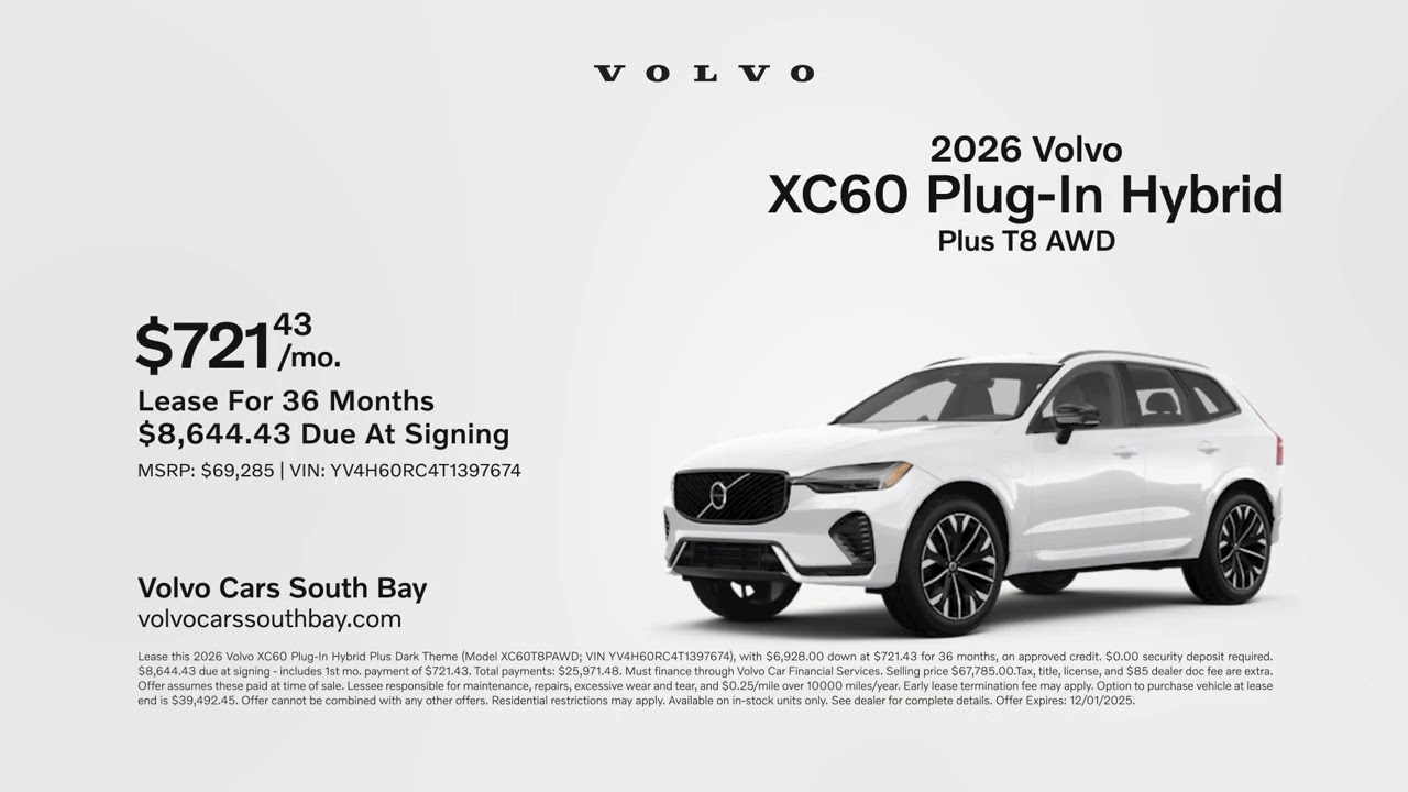 Volvo XC60 Plug-In Hybrid 11/05/2025 6396661 Discover your new Volvo right now at Volvo Car South Bay. Come lease a 2026 Volvo XC60 plug-in hybrid for 721 per month. The search is over. Visit us today at Volvo Carar South Bay. Electric CarsElectric VehiclesEVHybridHybridsPlug-in HybridsPlugInvolvoXC60Related Posts Plug-in Hybrid Electric Vehicle Market Outlook 2025–2033 January 12, 2026 New Geely plug-in hybrid SUV to debut in 2026 January 12, 2026 Survey shows EV interest up only slightly year-over-year, ICE and hybrid remain flat January 12, 2026 Stellantis discontinues production and sales of many plug-in hybrid models January 12, 2026 2026 Hyundai Santa Fe Plug-in Hybrid 288 HP 4WD Acceleration Test January 12, 2026 New Geely plug-in hybrid SUV to debut in 2026 January 12, 2026