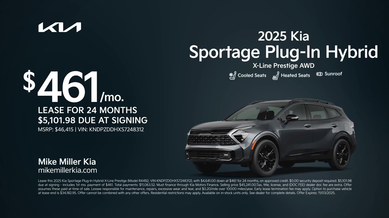Discover your new Kia right now at Mike Miller Kia. Come lease a 2025 Kia Sportage plug-in hybrid for461 per month for 24 months. Now during season of new tradition sales event, visit us today at Mike Miller Kia.