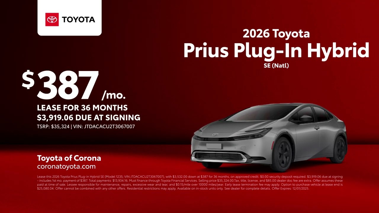 Toyota Prius Plug-In Hybrid 11/07/2025 6420786 Discover your new Toyota right now at Toyota of Corona. Come see the latest lease offer on a 2026 Toyota Prius plug-in hybrid. The search is over. Visit us today at Toyota of Corona [Music] Electric CarsElectric VehiclesEVHybridHybridsPlug-in HybridsPlugInpriusToyotaRelated Posts All you need to know about Ford’s electric vans January 13, 2026 PHEVs Pollute Worse Than Gas Cars If They Aren’t Charged Up January 13, 2026 Volkswagen Reveals Flagship Luxury ID. Era 9X PHEV SUV In China January 12, 2026 Stellantis Pivots From PHEVs to Hybrids and EREVs in North America January 12, 2026 Car giant swings the axe on PHEVs January 12, 2026 “These 5 Plug-In Hybrids Make EVs Look Complicated” January 12, 2026