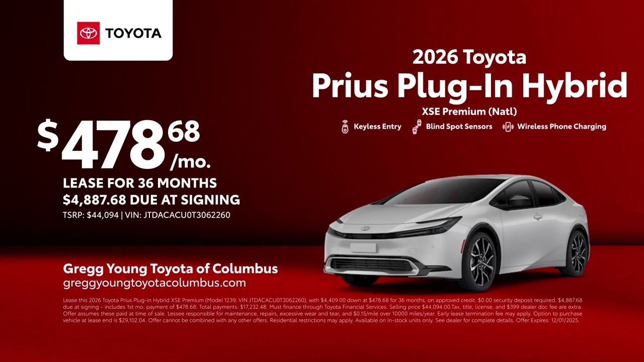 Discover your new Toyota right now at Greg Young Toyota of Columbus. Come see the latest lease offer on a 2026 Toyota Prius plug-in hybrid. The search is over. Visit us today at Greg Young Toyota of Columbus. [Music]