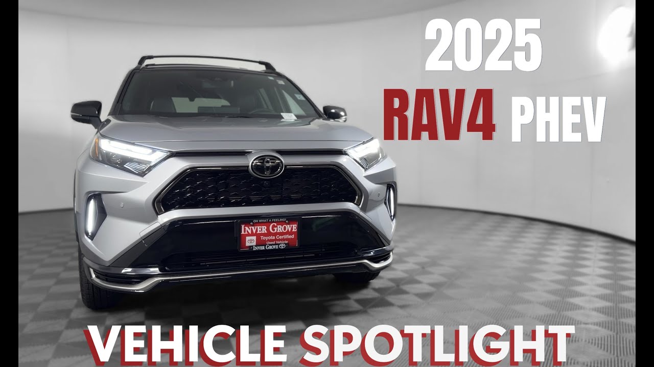 Hey guys, Jeremiah here with Inver Grove Toyota. Today on vehicle spotlight, we have a 2025 RAV 4 XSSE. This is our third, what, Sam? Do you think fourth try doing this with our audio, so hopefully this one comes out well for you. Follow me up front and let’s look at this. So up front here, the XSSE has a unique front styling. One of my favorite things about it are the accent lights. You’ll see right down here, meshed with your daytime running lights up above and your honeycomb grill. makes a really attractive front fascia. This one is a fully loaded XSSE, so you have your front and rear parking sensors, 360° camera, heads-up display, digital rearview mirror. We’ll go all over all of that here in just a minute. Follow me alongside. You’ll see these nice big wheels over here. Super good looking on this XSSE, especially with the silver color. Really makes a nice contrast along with your black moldings down here around the wheels, on the bottom of the car, on your mirror caps, as well as on your roof. Super nice look there with everybody wrapping their roofs black. This one just comes from the factory. It’s nice and well fit. Looks really nice. Coming along back over here on the XSC. Um the rear end also follows that same kind of design language with that black and body color look that you see over here. You have your running lights over here that are turned on right now. And one of my favorite things is they got rid of the Prime thing, the Prime name. They finally changed it to something people understand in the marketplace. Prime was cool, but now PHEV is cooler. So, plug-in hybrid electric vehicle. Remember that because the 2026 redesign is also going to have that same name. So, PHEV, you see it right down here. Super cool logo. Follow me over here. We have the plugin over here. So, this is the plugin. Plug-in hybrid, of course. This is how you plug in the vehicle. This one from new comes with a standard 120 volt household outlet that you plug in here. Charges the vehicle from zero to 100 100% in about six six and a half hours. You can also do level two charging, which not many people do because it’s a plug-in hybrid. It’s primary mode of propulsion is the internal combustion engine inside the vehicle, but you can plug it in to get up to 40 mi of electric only range or to supplement your hybrid drive mode as well. Um, super unique. Here at Ever Grove Toyota, we sell tons of new and certified pre-owned vehicles. You’ll notice the plate bracket on the back says certified pre-owned. This is a certified pre-owned vehicle with only 300 miles on it. This one comes with two keys, your charger, um, as well as if you’re local, one year of free maintenance, too. Now, let’s show you the rear end. [Music] Coming back here in the rear, this one has all of your floor mats already installed, your Cart Toronto cover, but that’s not what I want to show you. I want to show you this outlet back here. 1,500 watts. If you watch the Tacoma video, you remember over 2,000 watts in bed outlet capacity. 1,500 in this one. That’s huge. That’s crazy. I don’t even know what you’re going to put back here. That’s 1500 watts. You can game or something back. I don’t know. Um, plug in anything you want back there along with a 12vt. And if you’re want to listen to loud music, you have a subwoofer back here as well, too. JBL sound system. It’s really nice. I have that sound system in my Tacoma. I actually really, really like that in my Tacoma. This tailgate right here is programmable. So you can have it open to a specific height and program it to that height. So if you can’t have it this tall in your garage, you can program it to open a little bit shorter than that. Now let’s go inside and talk about some stuff in there. There’s a lot of really cool stuff I want to show you in there. All righty. Inside of the XSC, beautiful interior in here. You have your contrasting stitch seats, your perforated center with the black, red, and a little bit of white stitching in here. Makes for a beautiful interior. The most important thing to me are two things. The driver’s seat, super adjustable. You have your lumbar adjustment back here, your back adjustment like most vehicles, your front and back, but you also have height adjustability up here and your taper adjustability, too. So you can get in a super comfortable driver’s position over here. A really nice thing that I like also is the tilt and telescoping steering wheel. So you can fold that down, come in, out, up, down, however you want to adjust it to get it to your perfect driving position. And then just make sure to lock it back there too cuz that’s important as well there too. Um, inside here on the lower left hand side, you have your auto highbeams, your um, your view button over here for your 360 camera, your heated steering wheel, your odometer and trip computer, your tailgate open and close back here. You also have heated and cooled seats over here too. Down below that, you will see your drive mode selector. You have three modes: eco, normal, and sport. Sport turns everything red. It’s probably my favorite drive mode to drive them in. Being a plug-in hybrid vehicle, it’s no slouch. It’s actually pretty quick in sport mode. Here, it changes the dynamics of the steering as well, so it makes it feel a little bit more sporty. Up above over here, you do have your huge screen here. I love this. It’s got wireless Apple CarPlay, wireless Android Auto, your maps, all built right in there, too. Um, you also with the Toyota connected services can have your remote start built in there, too. So, if you want to remote start your vehicle from your phone, you can do that. You can lock it, unlock it, set the temperature for certain vehicles. You can even have a digital key. So, your phone would be your key, which is super cool. Up top over here, you have your digital rear view mirror. You can turn that on right up here with your home
