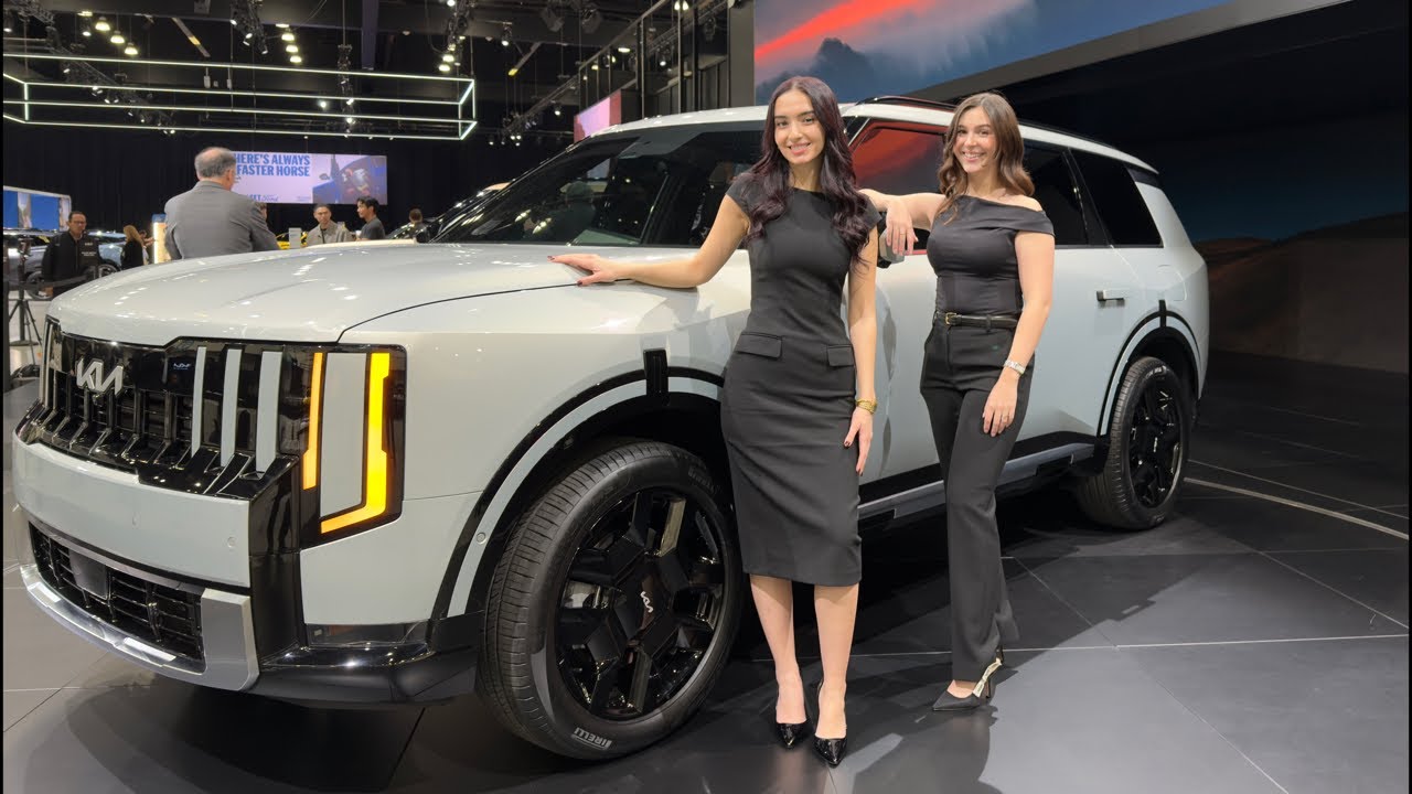 Back to the the Hyundai channel. I’m Gabby. I’m Charlotte. And we are inside the 2027 Kia Teleride Hybrid. Hybrid. So, this is a new powertrain. This is a brand new powertrain. It’s a brand new redesign. And this vehicle, it’s really going to surprise you. They’ve listened to their customers. They’ve given us what we want and we get to walk you guys through it today. Yep. And not to drop any major spoilers right at the beginning of this video, but we thought this was going to be the new and exciting powertrain. Turns out we have two new exciting power trains. So, if you haven’t seen our new video on the Telluride X, not XRT, XPro. Go and check that out. We’ll have it linked down below for you guys. And if you haven’t already, like this video, subscribe to the Kia Hyundai channel because we’re the Kia girls. We’re the Hyundai girls. We got it all. You know, we’re going to cover it. All right, let’s get out, talk about the exterior and the powertrain first, and then we’ll hop in and talk about this interior that’s got a fun color. Spoiler alert, we got new door handles. Here’s your demo. Now, let’s go and see our first look at what the exterior is. And you guys let me know what you think and then we’ll find Gabby. There she is, the queen herself, because the wheelbase has been extended by 3 in. So, not only does I give this vehicle a very, very well stance, I mean, it it stands out a very stout at the OP show. Everyone’s crowding this. It’s you can’t not look this. It’s very changed everything. It’s a full inch longer and base and a slightly taller. The car has transformed from that almost like exterior styling to more so a modern bold yet smooth design. Let’s start off on the front end first with our grill because the hybrid has an exclusive grill design that we just don’t see on our regular gas. So, while we still have a lot of gloss blacks for the housing of the headlamp unit and even the grill itself, you’ll notice that there is a ton more body color for the exterior contrast. So, all of this will be in the same tone as the rest of your exterior. So, that separates the grill quite a bit. It expands towards our center here, stopping at around the third mark. Now, the main focus of the grill, right smack dab in the center, is our Kia emblem. And that Kia will be finished with a satin or brushed aluminum touch. So, this adds a ton more contrast and gives the hybrid a bit of a lighter look, less rugged that we see on things like the X Lines and the XPros. We also have a forward- facing camera, and that is one of the many exterior cameras we’ll find on the 360 vehicle. It pieces together a full live image of everything happening around you. So, if I’m moving my vehicle forwards and I approach another car’s bumper, it shows me just how close I am and also gives me audible alerts. The lower portion of our grill and also our lip essentially is finished in satin chrome to add to that bright contrast. So, dark meets light, the way I like to call it whenever we see this on our vehicles. Now, coming along to the wheels. These are I think one of my more preferred styling choices on the Teller red line. So, if you watched our X Pro video, you’ll notice that we have a smaller alloy in a big beefy boy tire. Now, we have a 20-in alloy and full gloss black design with our bright Kia logo in the very center. The tire itself is a Pirelli Scorpion allseason tire. And the Is everything okay, Charlotte? Yep. All right. And as far as our all-wheel drive system goes, I can speak for us in Canada. We have all-wheel drive standard on the ride, which also includes without having to add on any sort of package, snow mode, mud mode, and sand. Now, each of those drive modes are going to change the way your torque is split on the vehicle, as well as how the stability and traction control operates. Now, that won’t change. We are still getting that, and it looks like the states is getting it, too. No word yet, though, on if it has to be added on as packages afterwards. The wheel arches are also special to the hybrid. So, we have a bit of a sandwich style. There’s gloss black on the outer and inner ring. And then the very center is finished in your body color paints. I don’t have the paint coat or the name of this paint coat. I wish I did, but it is a bit of a blue silver, a very bright color, and it is certainly metallic. It’s got a beautiful shine to it. I hope we get this in Canada. Your mirrors are going to be power folding with a little bit of the black surrounding our repeaters. And I’ve got to shout out to whoever’s sitting in there because they hid the hazards and it illuminated. So, you got to see it in action. We also have our blind view monitor. And then, of course, we have a ton of advanced driver assist instruction functions. So things like highway driving assist level two that does its own automated lane changes as well as our smart cruise control, blind spot detection, blind view monitoring, forward collision avoidance, rear cross traffic collision avoidance, you name it, it will be on the newell ride. Now I realize I didn’t talk to you guys about our powertrain and that’s what if you’re buying the hybrid for really. So let’s work our way over towards the front. So I can’t pop the hood unfortunately, but it only feels natural to show you it. And it is a long, wide, and character lined. Good. So, we have a 2.5 L turbocharged inline 4 and that’s actually the second 2.5 L turbo in the Teleride powertrain lineup. That’s right. The gas model is now also a four-cylinder drive. But this one also has two electric motors to join its force. That will give you the blend of efficiency from the electric motor, but also the enhanced torque output. So with this gasoline powertrain in that electric motor, we have a combined output of 329 horse with 339 pound feet of torque. Those are big numbers and that’s actually quite more impressiv