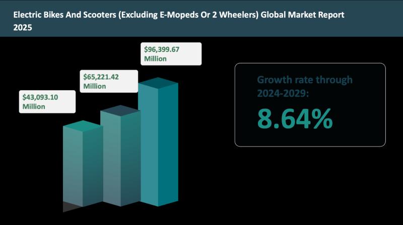 The global electric bikes and scooters (excluding e-mopeds or 2 wheelers) market was valued at approximately $43.09310 billion in 2024, reflecting a CAGR of 12.12% since 2019. The market is projected to rise from $43.09310 billion in 2024 to $65.22142 billion in 2029 at a growth rate of 8.64%, and is forecasted to grow at a CAGR of 8.13% post-2029, reaching $96.39967 billion by 2034.