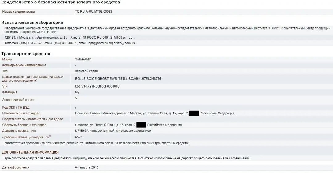 The Rosstandart database lists a Vehicle Safety Certificate (SBTS) issued for this vehicle, dated August 4, 2015. A certain Evgeny Aleksandrovich Novitsky is listed as the manufacturer. A person with this name in the Unified State Register of Legal Entities (USRLE) database is the founder of Luna LLC (Moscow), which specializes in the sale of passenger cars and trucks. The documents indicate that the mysterious ZIL-NAMI vehicle was tested at the NAMI facility to obtain the SBTS.
