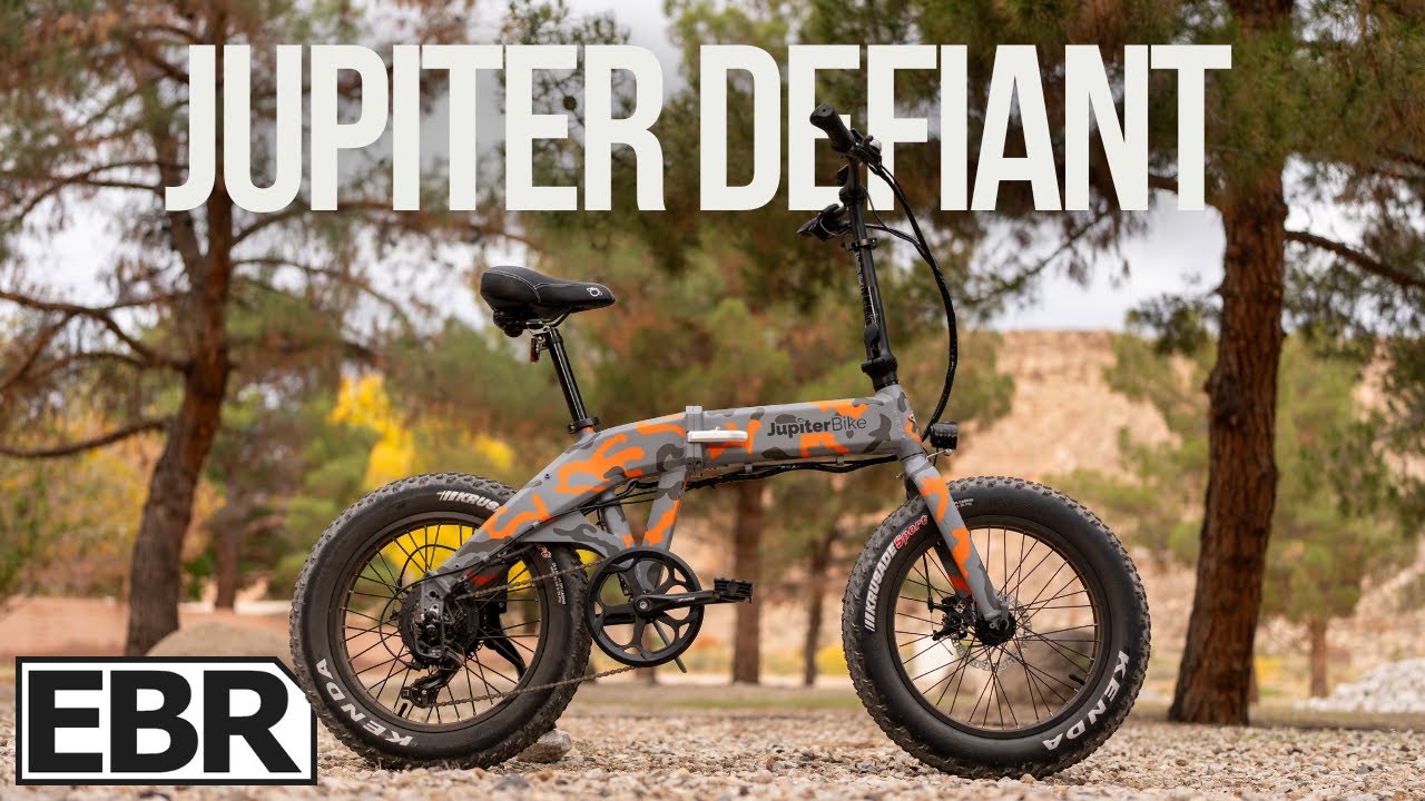 All right, guys. This is the Jupiter Defiant. It’s a folding ebike that ships as a class 2. And at first glance, you can see this breaks some of the molds from what we typically see in a folder. Not only from this paint job, but the frame design itself is a little unique. And then beyond that, sometimes folding ebikes can be 60 lb, upwards of even 70, and in some cases 80 lb. But this one breaks that mold by coming in at just 52 lb. So, let’s run through all the specs and features and see what else is unique in this review of the Jupiter Defiant. [Music] [Applause] [Music] All right, let’s go through the basics of the Jupiter Defiant. Now, this is a class 2 ebike, meaning it ships to you with pedal assistance and throttle to 20 mph, but of course, you can unlock it to class 3 speeds with an interesting caveat that we’ll talk about in just a few minutes. Now, this is priced at $1699 and it’s UL2849 certified. Now, when it comes to weight, they say this bike weighs 55 lb, but I threw it up on the scale without the battery and it was just 52 lb. And the battery is not very heavy. It’s only around 6 12 lb. So, when I put the battery in it, the bike is still only 58 lbs, making it a lot more manageable than many of the ebikes we see. Now, when it comes to the frame colors and geometry, this is the orange camo, but of course, if you’re not into camo, this is obviously kind of a more expressive paint job. If you don’t like this, they also have a very normal looking white or black you can pick from. And then there’s one other camo. It’s like a green camo. So, you have several options between two different camos and two different a white or a black as well. Now, in terms of size, it’s a one size. Fits most from 5 foot on the low end all the way to 6’2 on the high end. Now, I’m 5’11, so I’m kind of right in the middle of that range, kind of on the taller end of it. But either way, I felt it fit me just fine. There was no issues anywhere. So, I don’t have any concerns about their fit range that’s advertised. Now, when it comes to the geometry numbers of this frame, this has a 43in wheelbase from front hub to rear hub or vice versa. We have a um 16inch reach up top and we have about eight and a half inches of adjustability here in the seat post. Now, when it comes to max payload, the max payload on this is 300 lb. When it comes to tires and wheels, we have 20in x 4in wide Kenda Juggernaut tires. These have a nice beefy all-terrain tread pattern pattern on them, and they are on a 20-in alloy wheel with offset spoke patterns to help with a better connection from that wheel totire setup. Now, in terms of things like the accessories, practical everyday features, this bike does ship with front and back fenders. I happen to just have them removed from different off-road testing I was doing, but it does come with two fenders. They’re kind of cool moto style fenders. I actually like the fenders a lot on this. I just have them removed right now, but you can also add a rear rack if you want to. And then on top of that lighting up front, we have an adjustable angle LED headlight up front. There is no tail light or brake light. Obviously, this doesn’t look like a downtown city commuter, so it doesn’t surprise me not to see that. You do have a reflector on the rear end just in case you do get into traffic or where someone has lights behind you, they will at least get that little visibility from the reflector as well. Now, also, there’s one thing I did wish it had that it doesn’t, and that’s just any mounting points for a water bottle cage. Obviously on a folding bike, the frames are a little unique and it’s not as traditional to be able to put water bottle cage mounts on these, but you can always slap on one on the handlebar up top, some sort of handlebar mounted cup holder if you wanted to or cage mount. Um, but none built into the frame. And again, you can add a rear rack for extra storage as long as you stay within that 300lb max payload. All right, so let’s talk about the power delivery on the Jupiter Defiant because that’s where this bike is really, really strong. So, in the back, we’ve got a rear hub motor, 750 watts, and it peaks at 1130 watts. Now, normally I’ll give you the torque specs on this, but they don’t disclose the torque specs. They just advertise it as being high torque. Now, meaning depending on the manufacturer, that could mean a lot of things, but at the end of the day, you always know if the torque is good just by how it rides. And when you take this off-road, it is extremely punchy. It’s extremely quick with acceleration, and it can crush hill climbs. So, while they just say it’s a high torque motor, the way it rides really does back that up. I don’t know the number, but it is a high torque motor. And you’re not going to be buying this thinking, “Oh, it’s underpowered or it can’t make it up hills,” cuz this certainly has no problem getting up them as you’ll see when we go out on a ride here in just a bit. Now, the battery, excuse me, the pedal assist levels on here, they are activated with a cadence sensor. The motor’s activated with a cadence sensor, and you have five levels of pedal assist, one through five. Now, this ships as a class 2, so max speed 20 mph and throttle speed 20 mph as well. So, when you want to go to class 3 because they do advertise it as being able to go to class 3 speeds or 28 mph, there’s an interesting aspect of that like I kind of told you in the intro and that is when you put this bike together, when I was putting it together, there’s a card inside that says essentially says, “Yes, you can go to 28 miles an hour. Here’s how you do it. But if you do, you’re probably going to void the warranty and you may cause damage. Now, I thought that was an odd thing to ship with the bike, especially one that’s advertised as going 28 mph. But after all, it’s called the Jupiter Defiant,