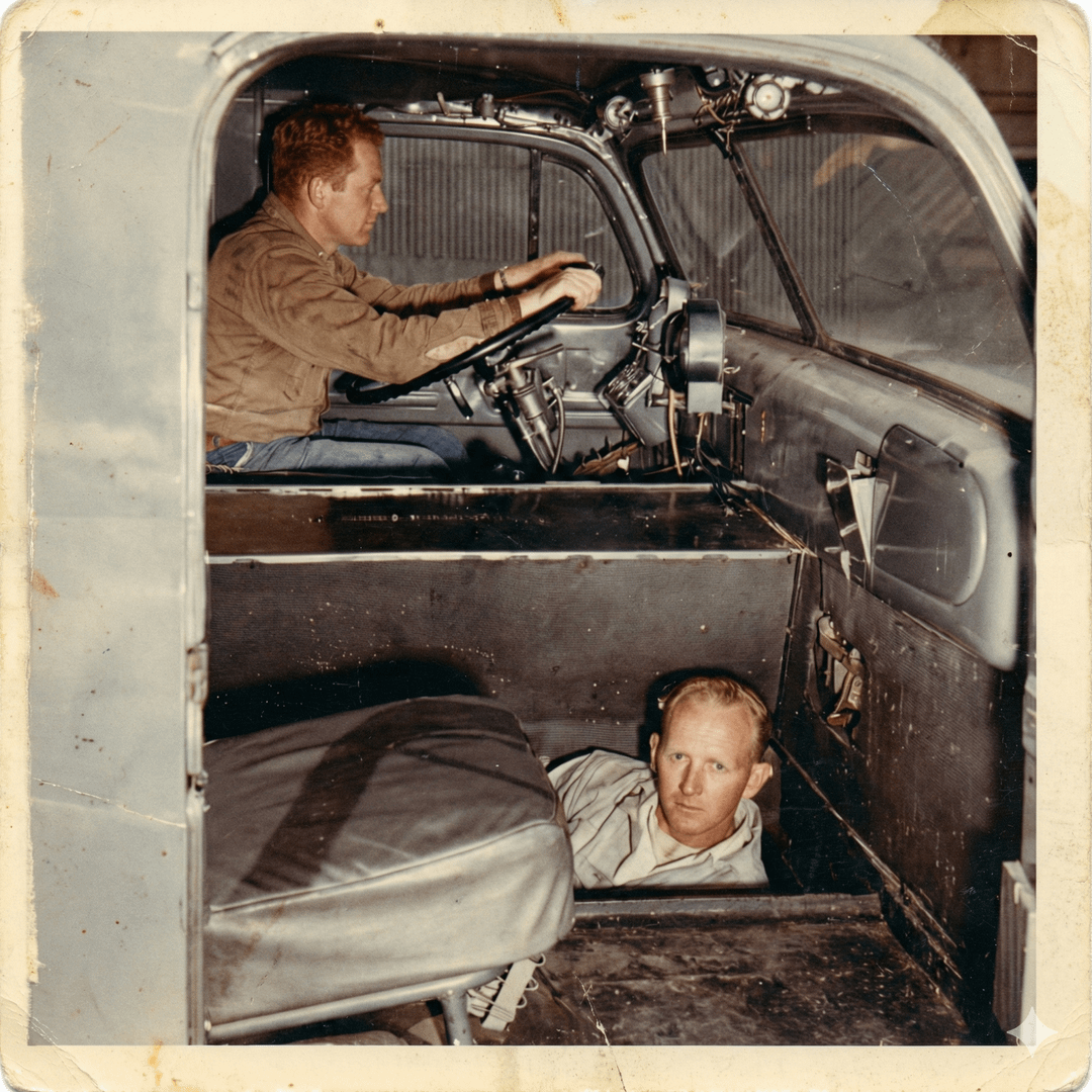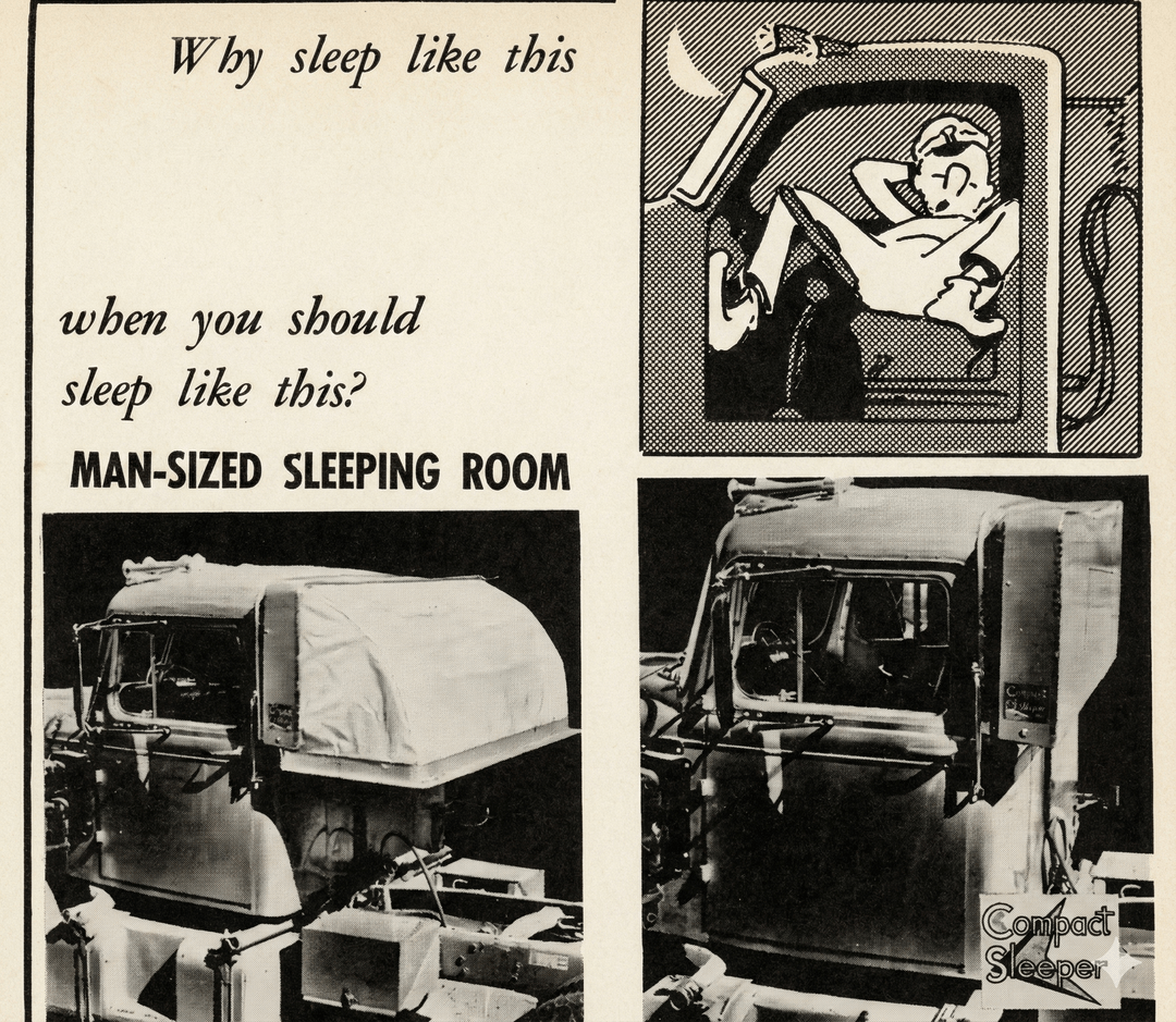 Before sleeper cabs were standardized, things got weird. A canvas “tent” hanging off the back of the cab and a literal hole under the passenger seat (1950s).