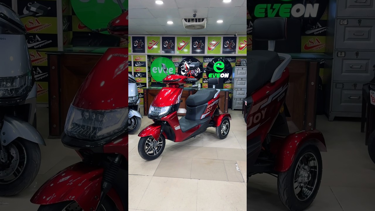 जितने भी लोगों को EV स्कूटर चलाते हुए यह डर होता था कि हमारे पांव नीचे नहीं लगेंगे तो उन लोगों के लिए खुशखबरी है क्योंकि यह है EVon Joy और यह अब थ्री व्हील में भी आने लग गया है। अगर मैं इसके डिज़ाइन की बात करूं तो यह पुरानी EVon Joy खड़ी है और यह नहीं है। इनके डिज़ाइन में बिल्कुल भी कोई डिफरेंस नहीं है। इसके फ्रंट में आपको एलईडी लाइट मिल जाती है और इसके फ्रंट टायर में आपको डिस्कस ब्रेक मिल जाती है। फ्रंट में आपको डिजिटल स्पीडोमीटर मिल जाता है जिस पे आपको सारी इंडिकेशंस मिल जाती हैं बैटरी वगैरह की और इसके अंदर तीन ड्राइविंग मोड्स आते हैं जिनको आप यहां से चेंज कर सकते हैं। उसके अलावा इसके अंदर रिवर्स गियर भी है और क्रूज़ कंट्रोल भी है। अगर मैं इसके बैक के टायर्स की बात करूं तो इसमें कोई स्पोर्टिंग व्हील्स नहीं लगे हुए बल्कि प्रॉपर व्हील्स अटैच किए हुए हैं विच शॉक्स और पिछले टायर्स में आपको ड्रम ब्रेक्स भी मिल जाती हैं। इसके अंदर 1000 W की डिफरेंशियल मोटर आती है और इसकी टॉप स्पीड है 50 कि.मी. पर ऑवर की और अगर मैं इसकी बैटरी की बात करूं तो इसमें 32 एंप की बैटरी आती है जो कि इसको 70 कि.मी. की रेंज देती है। और इस ईवी ऑन जॉय की प्राइस है ₹239,000 और अगर आप न्यू ईवी बाइक्स की प्राइसेस से अपडेट रहना चाहते हैं तो पार्क व्हील्स का न्यू बाइक सेक्शन को विजिट