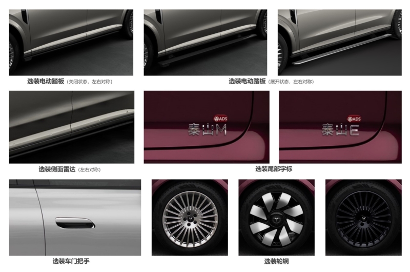 The optional configurations are electric side steps, side radar, rim shapes, door handles, and tail badge.
