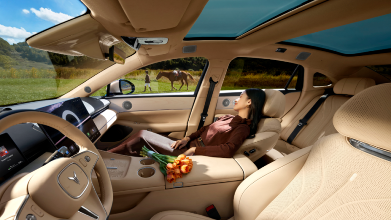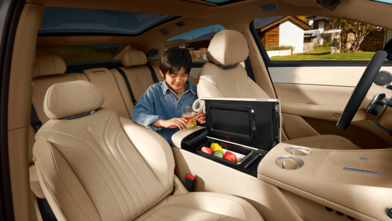 The cockpit also includes a 10.25-inch LCD instrument cluster, a 39-inch AR-HUD, and a 50W wireless charging pad for mobile phones. An 6.6L refrigerator is embedded under the center console with a temperature range of -6℃ to 50℃.