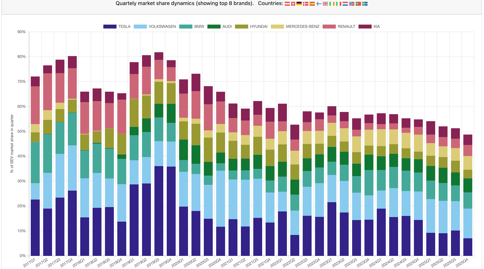 I was going to explore some European EV sales trends this week and ran across the following chart, which shows the 8 leading auto brands’ quarterly market share of the BEV market in 13 European countries (combined):