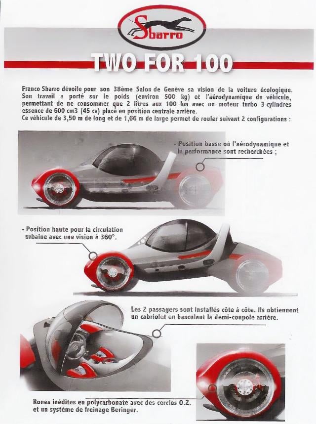 Sawce: http://sbarro.phcalvet.fr/voitures/twofor100/twofor100gb.html#:~:text=What%20surprised%20visitors%20to%20the%20Geneva%20show,to%20which%20Franco%20Sbarro%20must%20be%20accustomed.by MammothAmbition8910 Auto Artauto techAutomotive ArtTransport Technologyunusual vehiclesWeird WheelsRelated Posts Vintage Air Conditioning-where to begin? January 13, 2026 What are the worst luxury/executive cars ever made in your opinion? January 13, 2026 [BMW E34 5 Series Touring] in Chicago January 13, 2026 Spotted a [McLaren 765LT] in San Diego January 13, 2026 So, it’s 2026 and you got $105,000 to spend on a GM SUV. Are you getting a fully loaded GMC Yukon Denali or a base Cadillac Escalade? January 13, 2026 [Pagani Huayra] out shopping January 13, 2026