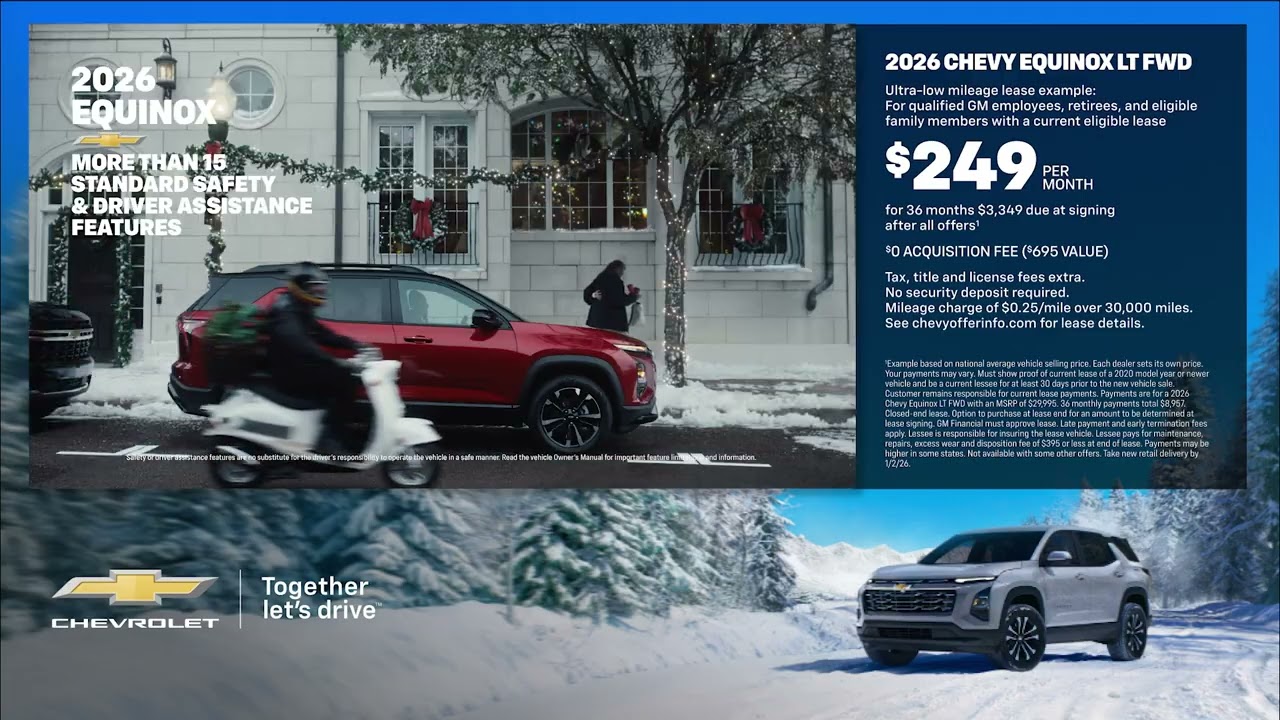 Gear up for the holidays in a Chevy Equinox THE CHEVY EQUINOX AND MORE THAN 15 SAFETY FEATURES AND A SILENT NIGHT GUARANTEED. CHEVY DETROIT. TOGETHER LET’S DRIVE. See current offers chevroletchevyElectric CarsElectric VehiclesEquinoxEVgearHolidaysRelated Posts Storage with some flex. #ChevyBolt December 29, 2025 Someone is coming to town… and he’s swapping reindeer out for horsepower. December 23, 2025 Steal every scene and stand out against every backdrop with #Bolt. December 18, 2025 Camionetas Chevy December 17, 2025 Two branches. One country. At the Army–Navy Game, we celebrate what drives us together. December 15, 2025 Helmet on. Relive the energy of Chevy fans at America’s Game like you’re right in the huddle. December 14, 2025