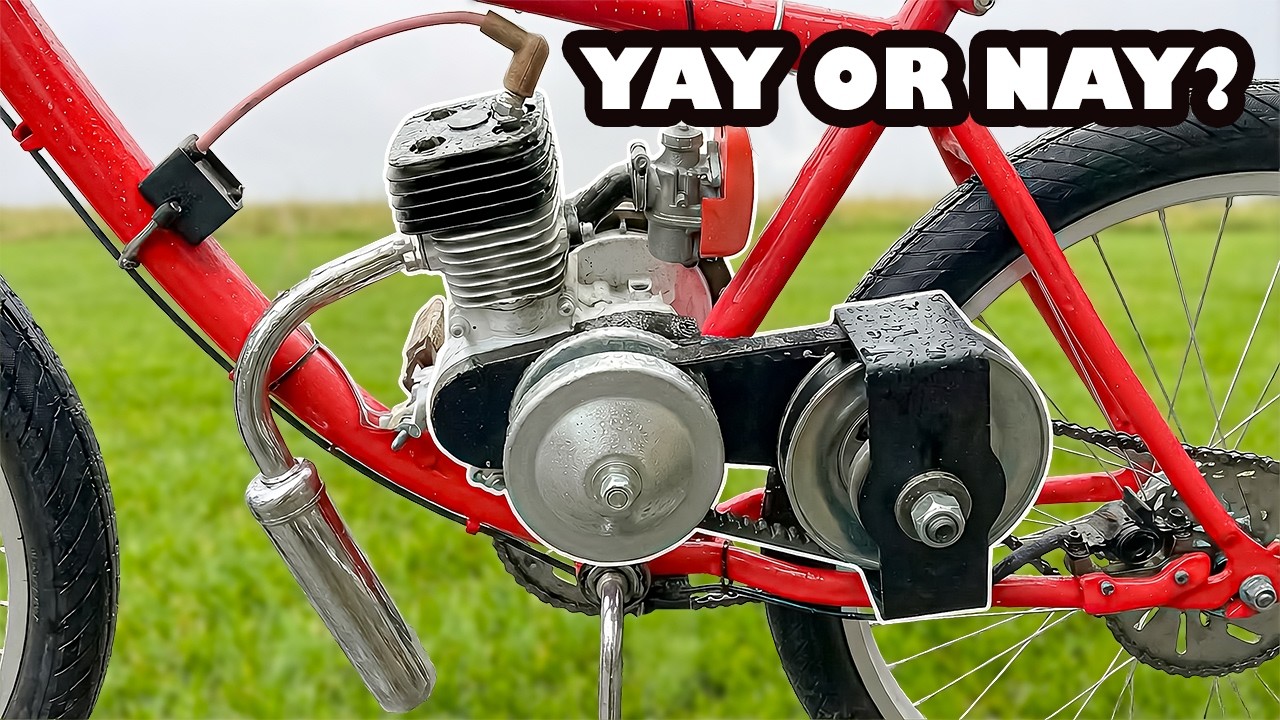 All right, guys. So, in a previous video, we put a torque converter on one of those classic motorized bike uh engine kits. There we go. We’re going to finally get this thing on a bike, put some wheels on [music] this frame, and get it on the road. So, the rims are going to be some heavyduty uh motorized bike rims off of Amazon. All right. Then, I bought some big old thick wheels. Those suckers should be nice and sturdy while driving around. Unfortunately, the hub diameter is too large for this sprocket mount, so [music] I had to shave it down a bit. But at the end of the day, we finally got that thing to fit just nice and snug. So, I do see some motorized bikes where they just take the disc brake and mount the whole shebang like this onto [music] the disc brake hub. But with this size sprocket that I have, I’m not going to be able to get a caliper in here without scraping some stuff. So, um I just need to cut a circle into this. In the previous video, I set up this CVT system, but um it was more for the sake of the video and getting it to work rather than getting it to work with the bike. So, I have to redo all this because that bearing will just hit against the wheel and the sprocket won’t line up. have to figure out a way to make a bracket that comes over and then has a another bearing for this side. I also thought I was having issues with the belt being too loose, but actually the measurements are right on with the stock torque converter plate. So, using that same finale board stuff, I cut out a new mount. Yeah, look at all that cancer dust. These two did good, but I don’t know what the hell happened there. I decided I need one more bend on those outer pieces and that’ll help tie everything together. So, since these new tires are thicker than your mother after a Thanksgiving ham, I got to cut out these little brackets because they get in the way. And that looks pretty good. I was still having an issue where the sprocket shaft was getting way too close to the wheel. So, I decided to cut that part off. And I think that extra space should work just right. >> [music] >> Once I aligned the chain and fit it up, I took everything apart and then painted [music] the bracket. I still haven’t solved the issue of having no rear brakes, so we got to make ourselves a bracket for the disc brake. If you’re a welder, you might want to just look away. I don’t really have any way to weld aluminum and I’ve never done it before, but I do have an acetylene torch, so I tried my best. Look at these perfect dimes. Beautiful. So, I think that’s kind of a product of trying to weld two different chemistries of aluminum together. I think that bracket is on there nice and good. I was using this filler rod and it has a uh flux in there, I think. So, anyway, if you grind it, clean it up. It looks pretty nice. I noticed that the chain was kind of rubbing up against the disc brake cable, so I just cut up some gas tube and that’ll protect it. Oh, yeah. We still have the issue of the motor being in the way of the pedals, so we got to extend those. Well, guys, being a oneman show [music] here at Oliver Motorized, filming myself can be really difficult. So, when Hover Air offered to send me [music] their self-flying drone, I had to say yes because this thing is a game changer. [music] So, some things I really like about this thing is it is just super small and compact, so I can just fit it in my pocket, [music] no problem, and take it wherever I need to film. It comes with tons of different uh pre-programmed flight paths. [music] It’s super easy to sift through all the different modes that it has. It [music] can orbit. There’s a ski mode. There’s a spiral mode. And then, of course, my favorite is the bike mode where it follows me um while I’m riding the bike, which makes showing off my projects that [music] much better. One thing is the battery does go quick, but thankfully the package comes with a whole other battery, so you can just [music] quickly swap them out. So, just in time for Christmas, be sure to check out the link below and get yourself or a loved one a Hover Air X1 Pro Max. [music] I’ll be completely honest, I did a lot of that just by eye, but it turned out pretty good. [music] [music] [music] >> [music] [music] >> So, one thing is I was thinking about trying to modify this engine to get more RPM and then we could use higher force springs, but I think this is more meaningful if we keep the engine completely stock, stock carburetor. This is just a kit you get off Amazon. So, that’s kind of the idea behind this video. So, if you watch the previous video, we did a bunch of experimenting with different springs. We came up with using some stock springs from Ace Hardware and those are what are in there now. So, we’re going to start it up and see how these guys work. Well, right away I noticed that these springs won’t cut it. I was full throttle and nothing was really engaging. All right, went a whopping 12 miles an hour. All right, [laughter] let’s take one of those springs out and just see what happens in [snorts] that case. Let’s flop this guy out of there. It did get me going without pedaling, though, so I guess that’s a good sign. This is with one spring. Oh, that’s much better. Ah, that was a solid 18 mph. So, before the test ride, I went and bought few more spring options. This is like a very low force spring. This is probably the lowest I could find on there by itself and see how that goes. If we get 30, I’ll be happy with 30 mph. We hit 18 with that one. So, yeah, let’s try it. I guess I got to take this whole thing off for this guy. Dang it. With that new spring installed, [music] it was a world of difference. The initial torque was way better. And then also the top speed was very surprising, too. And as you can see from a standstill, [music] this thing has enough torque to get me going no problem. One thing I noticed was that the torque converter still wa