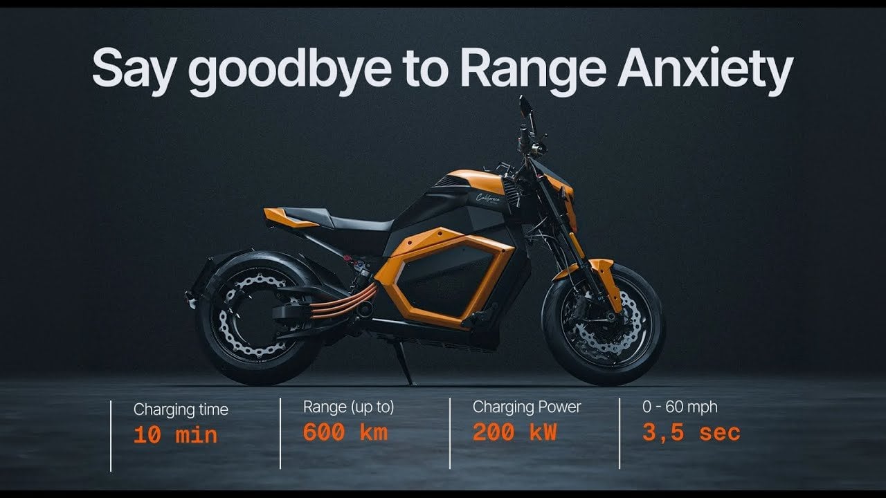 The motorcycle offers two battery configurations: a 20 kWh option with a 350 km range and fast charging, and a 30 kWh option with a 600 km range and ultra-fast charging capabilities.