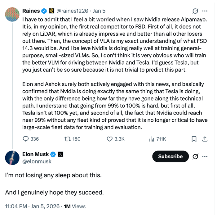 Alpamayo is the equivalent of semi-autonomous driving. It’s a development kit, not a complete production AI model that enables full, level 5 autonomy at the level of what Tesla is demonstrating today.