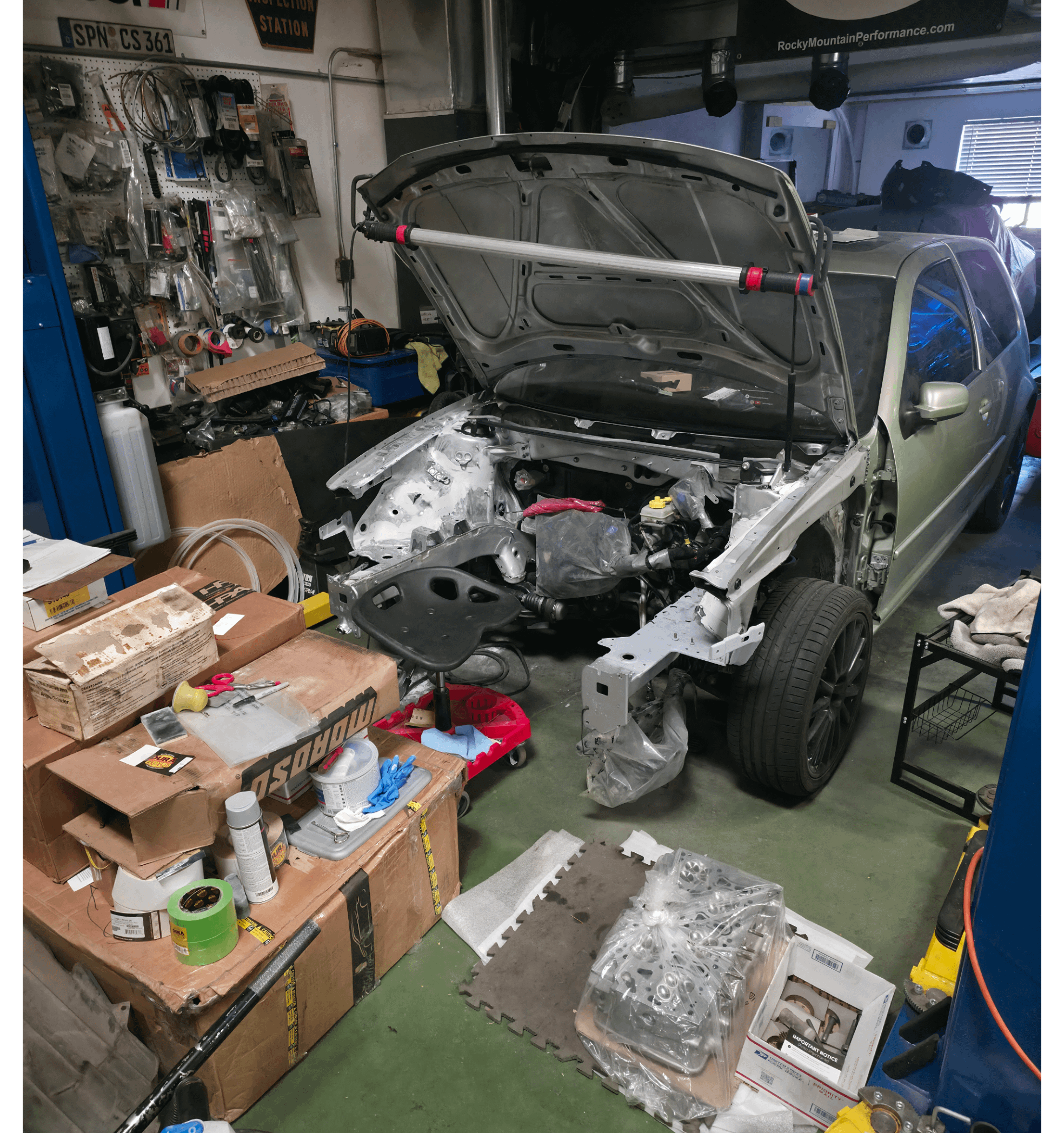 My VR is equipped with custom Integrated Engineering Tuscan rods, Mahle PowerPak Plus oversized pistons, racegrade main coated bearings along with racegrade rod coated bearings, Ferrea hardened valves with Supertech springs (with welded lifter shims for a very solid valvetrain), ARP Custom Age 625 connecting rod bolts, Raceware main and head studs, a 5mm head spacer (yes, 5mm, for longevity and high boost. Very high boost..), a fully custom 4+" intake with an oversized MAF, HPA's liquid cooled intake manifold paired with a fully divorced extra large refrigerated/cooling system, Snow Performance's Stage 3 Water/Methanol multiport injection kit mated to a massive Water/Methanol custom reservoir fitted to the spare tire storage well, KW V3 ClubSport coilovers, HPA space-grade monoblock 6-piston big brakes up front and 4-piston in the rear, an MQ500 transmission conversion running a lengthened European gearset (this will allow the turbo to really open up and show its true power across long pulls), custom TTRS engine/transmission mounts, custom axles, a fully custom interior inspired by one of my Nogaro Blue B5 S4's I owned many years ago (from the Konig seats being fully stripped and reupholstered with Goya Red, Dark Charcoal, and Deep Black alcantara EVERYWHERE, along with the steering wheel, the door cards, the shift boot, the custom rear package tray which is replacing the rear seats and possibly the headliner [tbd]), custom staggard Ghosted Forged 19×8.5" SinistR wheels up front and 19×9.5" SinistR wheels in the rear (don't worry, I will be running them with matching tire sizes to keep the Haldex system happy), a full roll cage to stay NHRA, SCCA, NASA, and FIA 'safety compliant'. There is quite a bit more that I will share as I get closer to putting this monster back on the road..