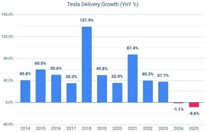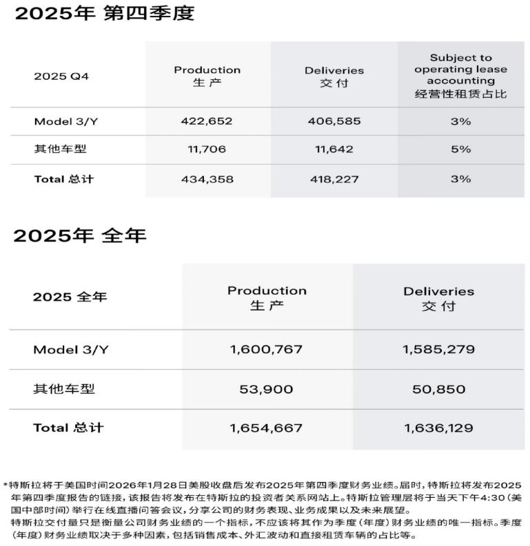 On January 2nd, Tesla released its vehicle delivery data for the fourth quarter and the whole year of 2025, both of which showed a significant decline. The data showed that in the fourth quarter of 2025, Tesla delivered 418,227 new vehicles, a year-on-year decrease of 16%. Looking at the whole year of 2025, Tesla delivered 1.636 million new vehicles, about 150,000 fewer than the same period in 2024 (1.789 million), a year-on-year decrease of 8.6%. This is also the second consecutive year that Tesla’s new vehicle sales have declined year-on-year.