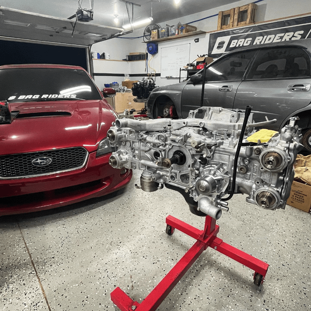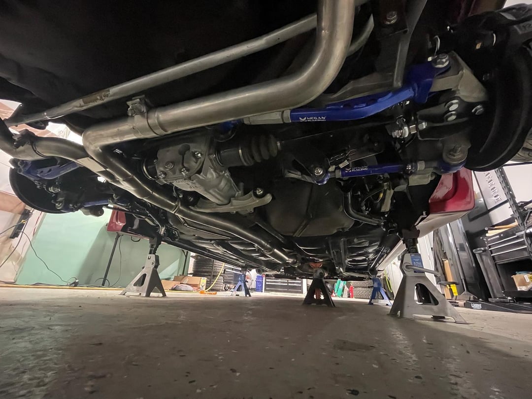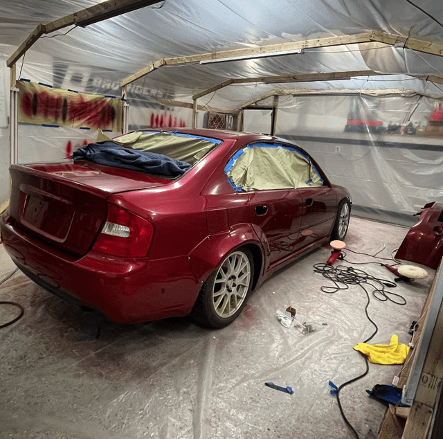 I did literally everything on this car myself, at home, and learned a LOT along the way, especially in body work. I did a full glass out color change respray to Subaru M1Y (crimson red metallic), building a DIY paint booth to get it done. I stripped the whole undercarriage down to bare metal, fixed a couple tender spots, then applied new epoxy, seam sealer and undercoat (second photo). New glass all around was due after all this hard work. I did a full engine build with forged pistons and an STi crank, and vapor blasted every aluminum part to make it all brand new. Not much work was done on the heads aside from valve seats re-cut by a local machine shop, and followed with a GSC valvetrain. The whole car has been done over and it shows— literally every nut and bolt was replaced or refinished. Over 190k on the chassis but you’d never know without seeing the odo!