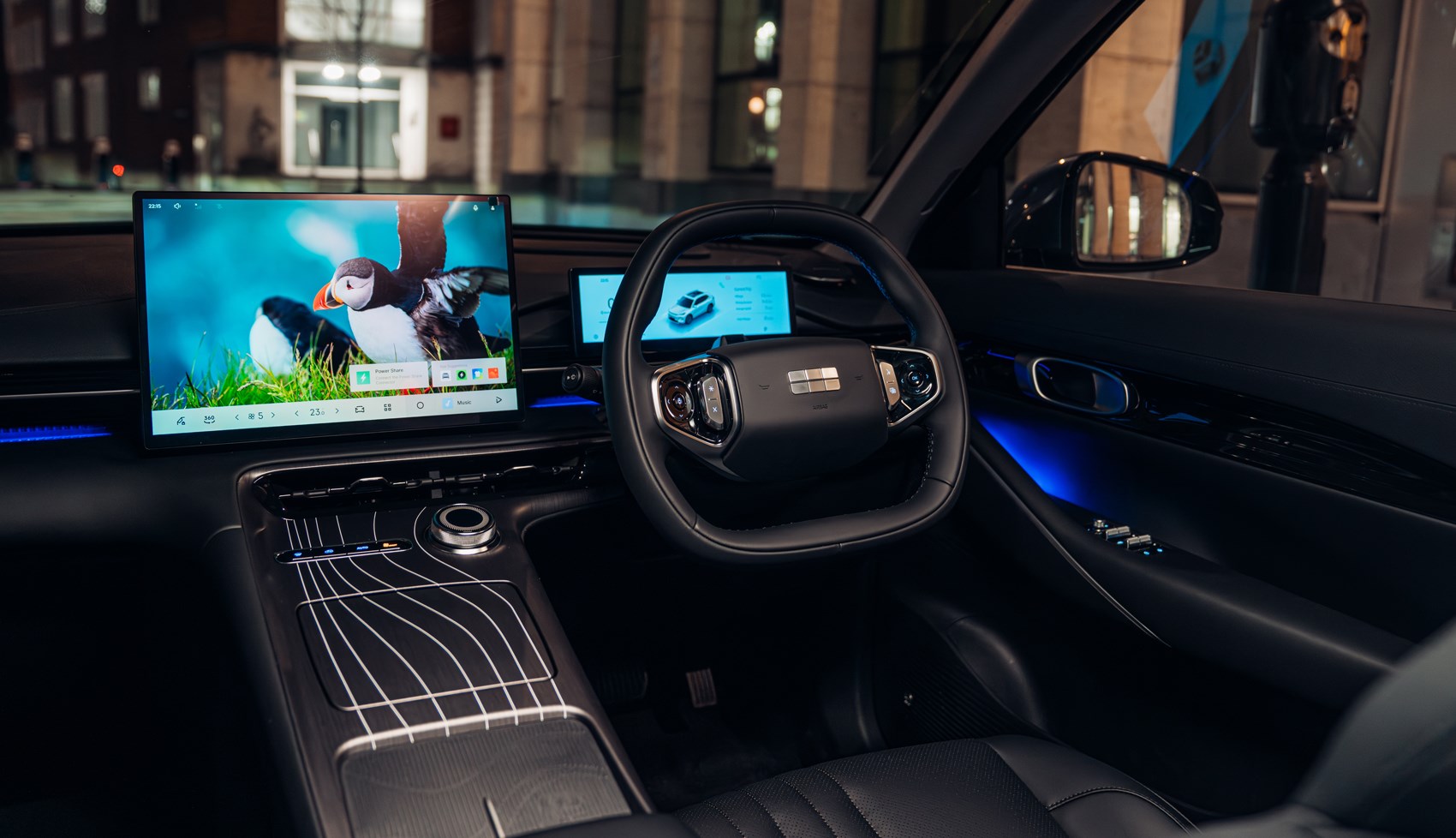 Again, it’s largely like the EX5 electric car. What impresses is the material quality inside; there are a lot of soft-touch materials and chunky-feeling buttons on the weirdly-shaped steering wheel, with a (very) select few physical controls on the dashboard. The most noticeable is a large click-wheel that can be used for audio volume and can be configured to control other functions like fan speed.
