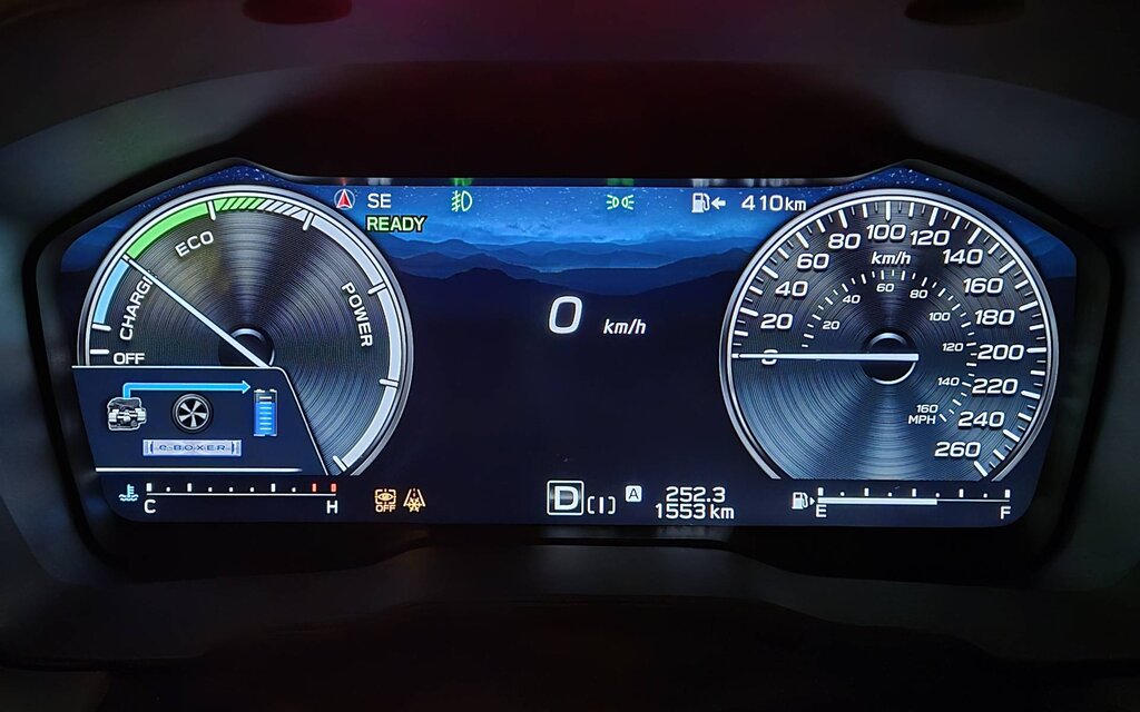 The silent, vibration-free start doesn’t last very long in cold weather as the boxer engine quickly fires up. Incidentally, our tests were conducted in temperatures ranging from approximately minus 20 to 0 degrees Celsius. That said, once warmed up, the vehicle operated smoothly and efficiently, managing to cruise in electric mode at a speed of up to 70-80 km/h.